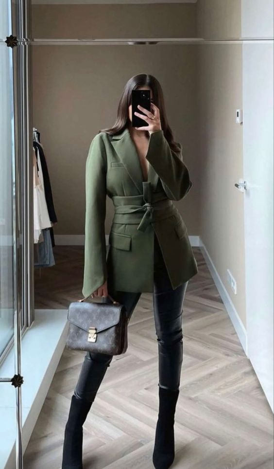 This bold and edgy look pairs a belted olive blazer with sleek black leather pants for a standout fall ensemble. The structured silhouette of the blazer adds sophistication, while the leather pants and pointed black boots bring an effortless cool factor. Finished with a luxe designer handbag, this outfit strikes the perfect balance between polished and modern, ideal for making a statement in any setting.