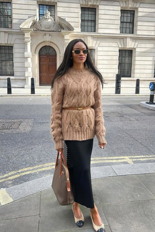 This cozy cable knit sweater paired with a sleek black midi skirt is the perfect combination of comfort and style for fall. The addition of a waist belt adds structure and defines the silhouette, giving the oversized sweater a chic, tailored look. Paired with two-toned flats and a large tote bag, this outfit transitions effortlessly from the office to casual outings while keeping you warm and fashionable.