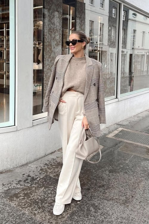Effortlessly stylish and ideal for cooler fall days, this look combines an oversized plaid blazer with wide-leg trousers for a relaxed yet polished business casual outfit. The neutral tones keep it sophisticated, while the cropped knit sweater adds a cozy, modern touch. Finished off with sleek white sneakers and a matching handbag, this is the ultimate blend of comfort and chic for any workday.