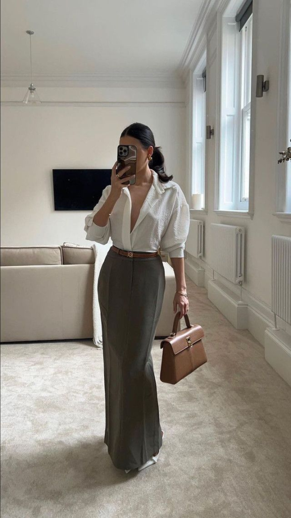 This effortlessly chic outfit features a crisp white blouse with a plunging neckline, perfectly tucked into a sleek high-waisted olive maxi skirt. The minimalistic silhouette is elevated by the addition of a slim belt and a structured brown handbag, adding a refined touch to the look. Ideal for formal occasions or elevated business settings, this ensemble exudes timeless elegance with a modern flair.