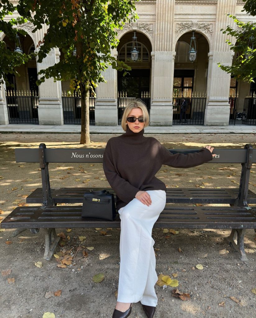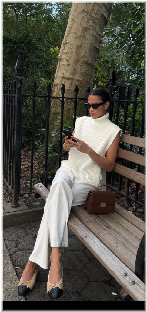 This crisp all-white ensemble pairs a cozy sleeveless turtleneck with flowing wide-leg trousers for a clean, minimalistic look. The elegant beige and black flats add a touch of contrast, while the structured brown crossbody bag complements the neutral palette. Perfect for a relaxed yet polished day out, this outfit exudes effortless sophistication with an understated elegance.