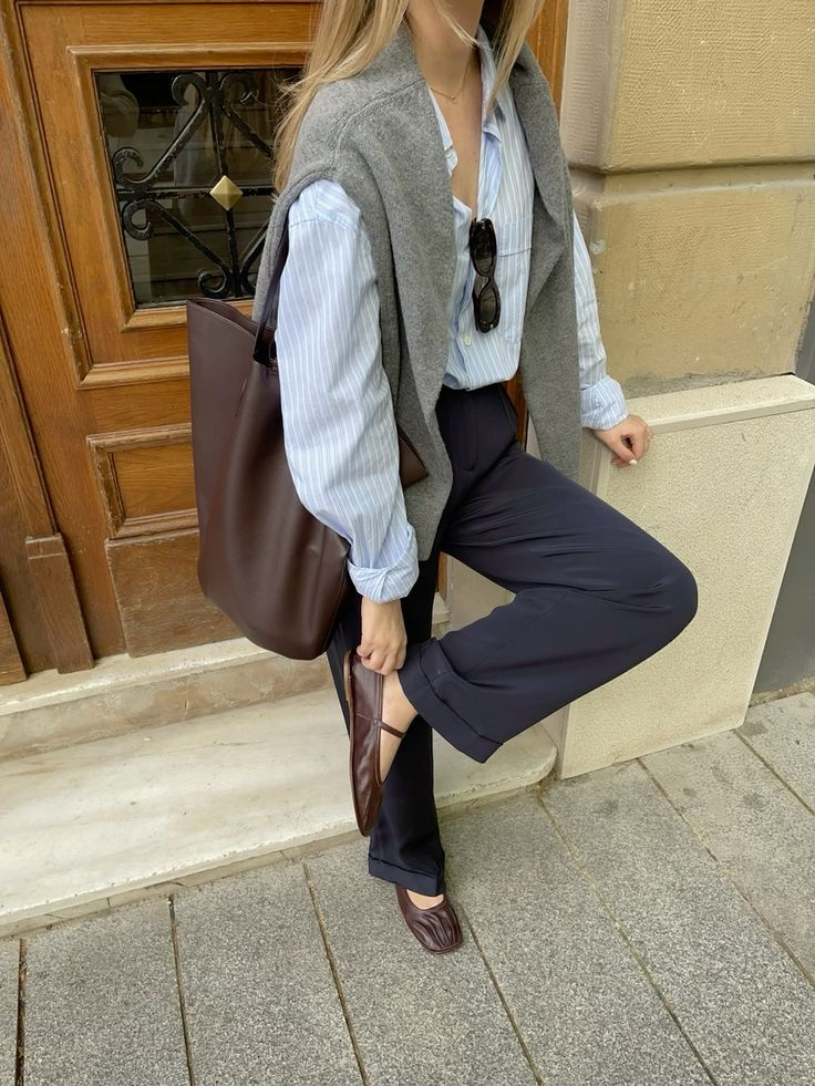 This effortlessly chic outfit combines a relaxed striped button-up shirt with navy trousers for a laid-back yet polished look. The draped grey sweater over the shoulders adds a cozy touch, while the dark brown flats and matching tote bag bring a touch of warmth to the cool tones. Perfect for a casual day out, this ensemble is both comfortable and stylish, blending classic elements with a modern, relaxed vibe.