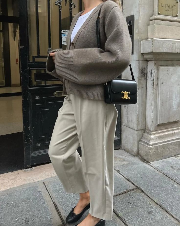 This laid-back yet elegant look features a taupe cardigan with oversized sleeves layered over a classic white tee, paired with beige wide-leg trousers for a relaxed silhouette. The black crossbody bag and matching loafers bring a refined touch, perfectly complementing the neutral tones. Ideal for a casual day in the city or a cozy coffee run, this ensemble combines comfort and style effortlessly.