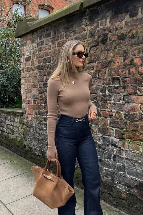 This sleek, neutral-toned outfit strikes the perfect balance between casual and chic. The fitted taupe turtleneck paired with high-waisted dark denim creates a streamlined silhouette that’s both flattering and polished. Add a brown suede bag and delicate gold accessories for a touch of sophistication. Ideal for those cooler fall days, this look is simple yet elegant, making it an effortless go-to for both workdays and weekend outings.