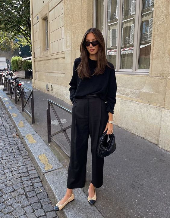 This effortlessly chic all-black outfit is perfect for a business casual look that transitions from office to after-work drinks. Paired with classic two-toned flats, it keeps things sophisticated yet comfortable. The sleek black trousers and matching top add a modern, minimalistic vibe, while the small black handbag ties it all together for a polished finish.