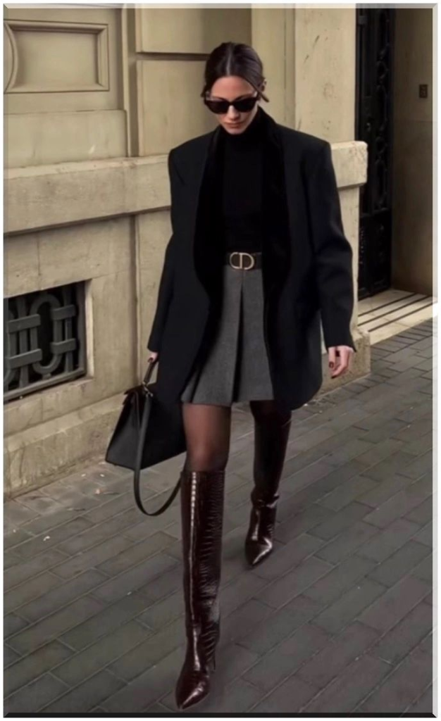 This look combines sophistication with a subtle edge, making it perfect for fall. The oversized black blazer adds structure, while the pleated gray skirt brings a feminine touch. Paired with knee-high croc-embossed boots, this outfit is all about bold elegance. The monochromatic palette with a belt cinching the waist creates a sleek silhouette. Perfect for a polished day out or a stylish office ensemble.