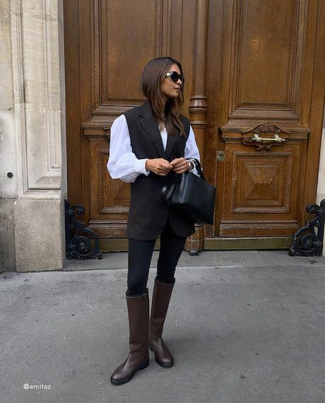 This bold business casual look blends classic and modern elements effortlessly. The oversized, structured vest layered over a white puffed-sleeve blouse creates a striking contrast, while the slim black pants keep the outfit sleek. The standout feature? Knee-high brown leather boots that add a touch of autumn edge. Paired with a chic black handbag, this outfit is perfect for making a stylish statement during fall.
