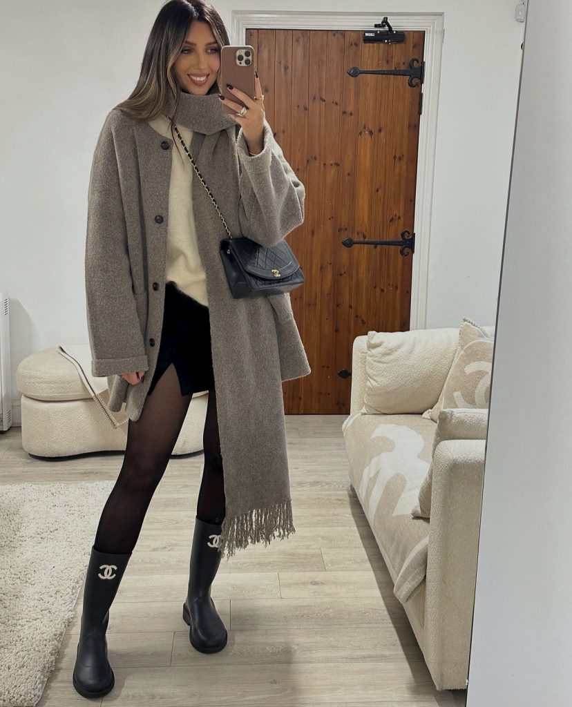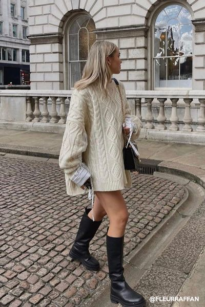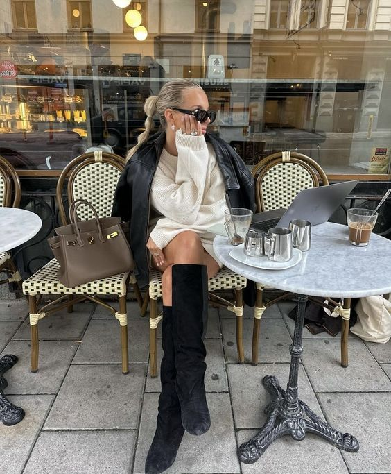 This chic fall outfit features a cozy knit mini dress belted at the waist for a flattering silhouette. Paired with sleek black knee-high boots and a classic oversized black coat, it’s the perfect mix of warmth and style. The quilted black bag with a gold chain adds a touch of elegance, making this the ideal ensemble for a stylish day out or a casual business meeting during fall.