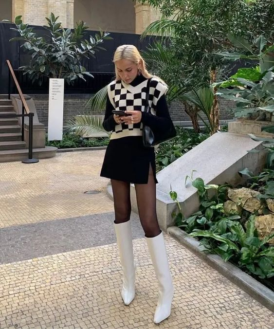 A classic black-and-white combination with a preppy twist, this outfit features a chic sweater layered over a crisp white collared shirt, giving it a polished and elegant feel. The sleek black mini skirt and sheer tights add a modern edge, while the structured black handbag with a gold chain brings a touch of sophistication. This look is perfect for business casual settings or an upscale day out, effortlessly balancing timeless style with contemporary flair.
