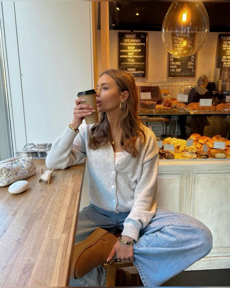 This cream sherpa cardigan paired with wide-leg jeans and fluffy UGG slippers is giving ultimate cozy vibes! Perfect for a casual coffee outing or just lounging around in style. I love how effortlessly chic this looks, especially with the tan tote to match.
