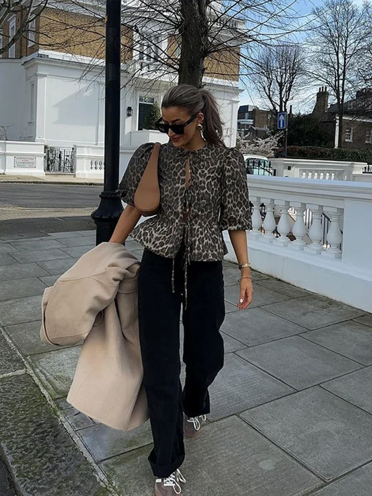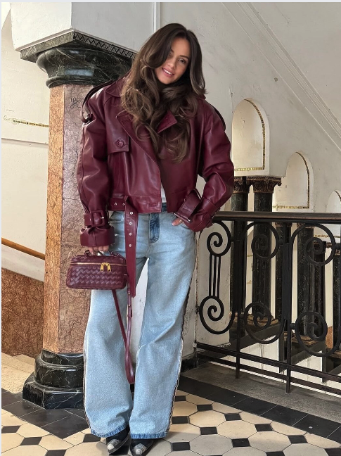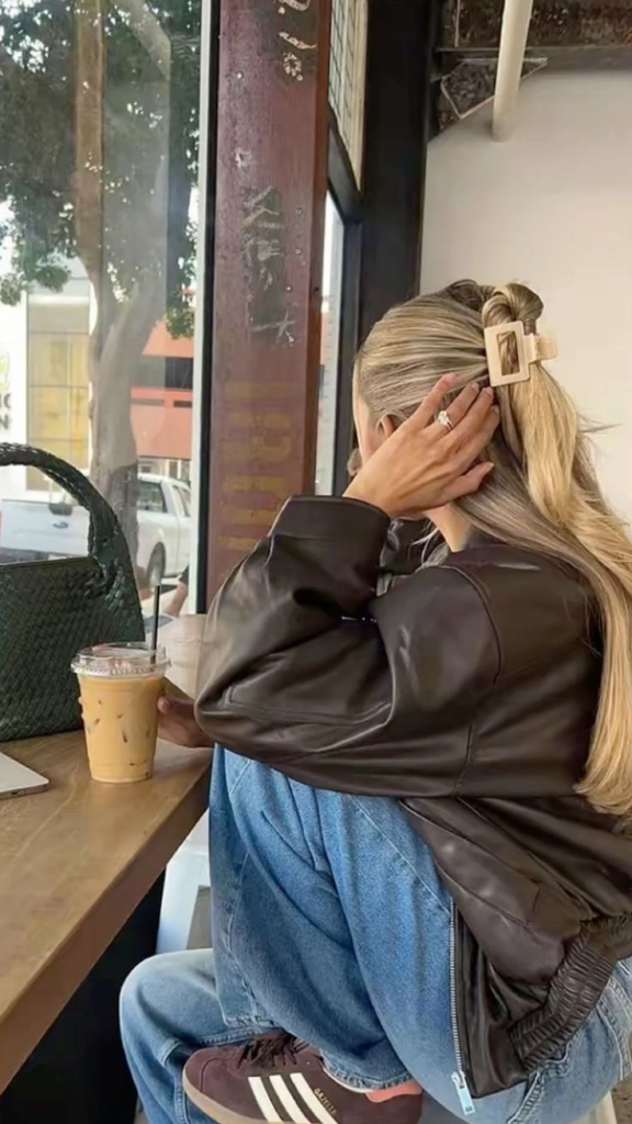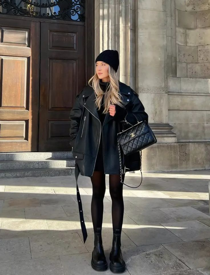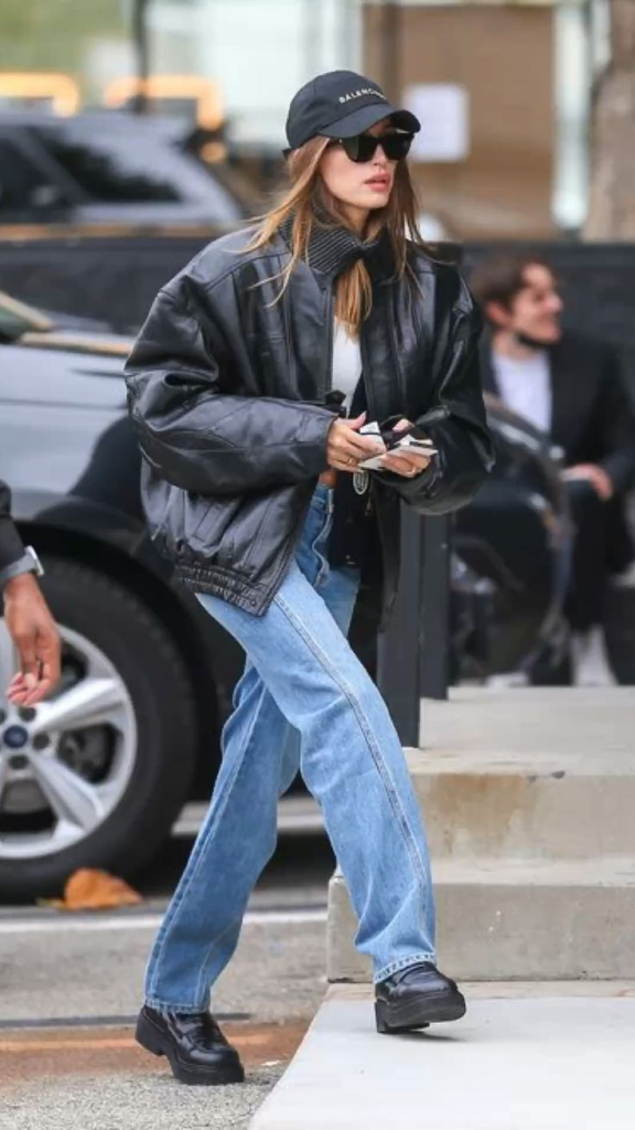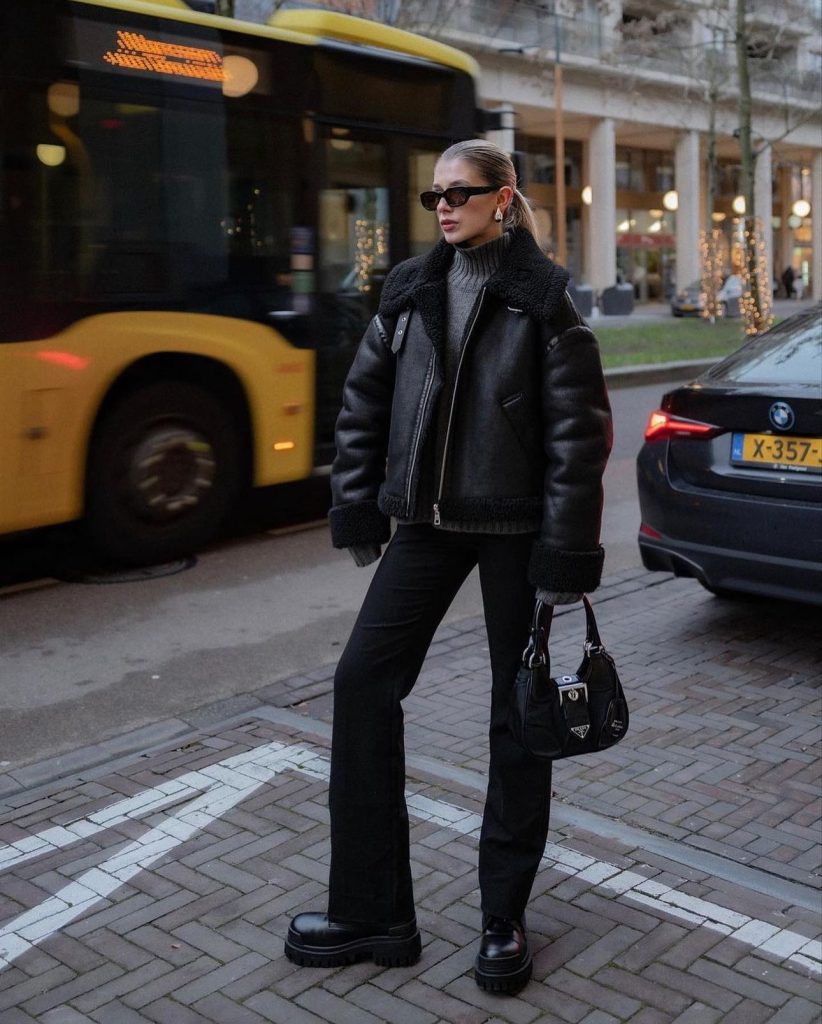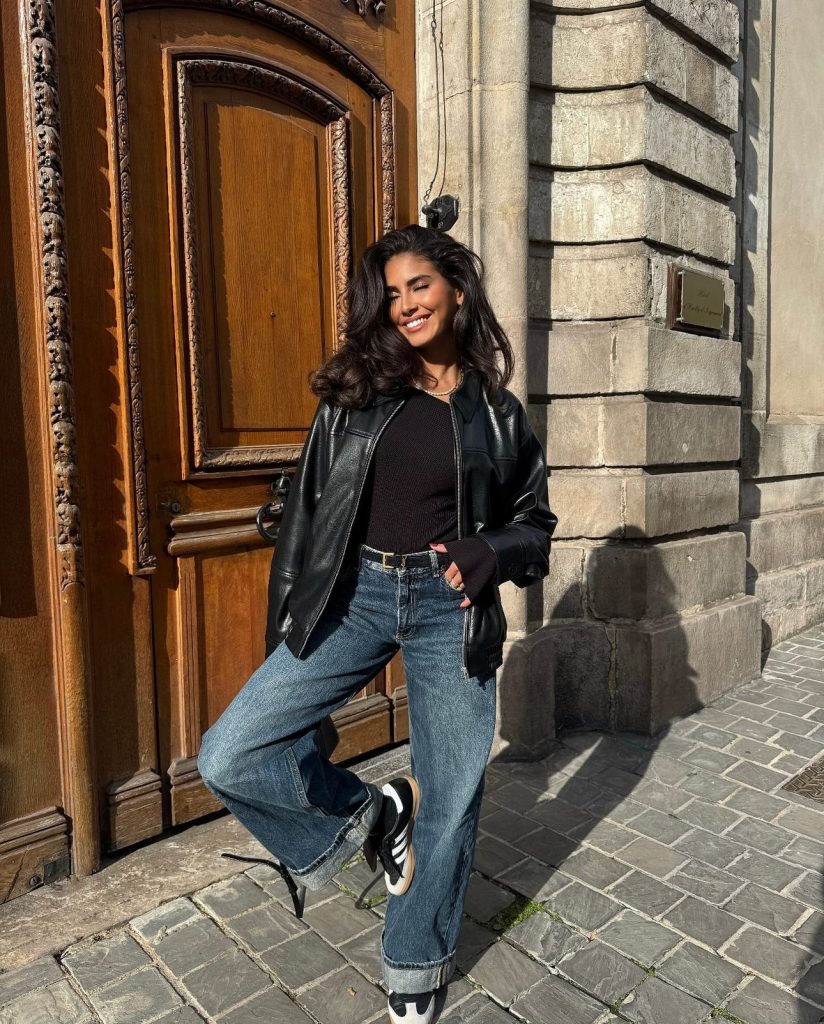 A black leather jacket is one of those timeless pieces that instantly adds an edge to any outfit. Whether you’re going for a laid-back, casual vibe or want to toughen up a more polished look, a leather jacket never fails. In this outfit, the jacket adds a cool, effortless touch to the black top and wide-leg jeans combo, giving off that perfect mix of classic and modern style. It’s the ideal layer for transitional weather and pairs beautifully with everything from sneakers to boots. How can you not love the versatility of a leather jacket?