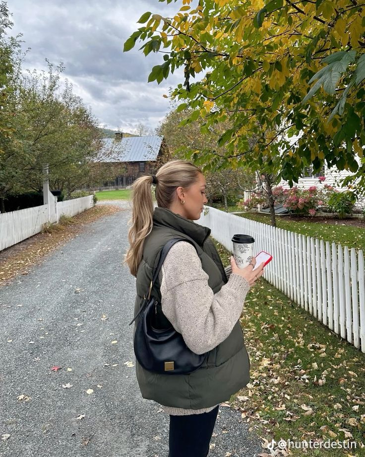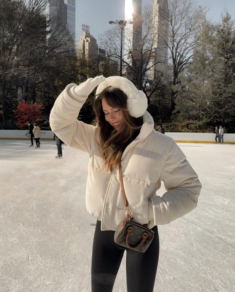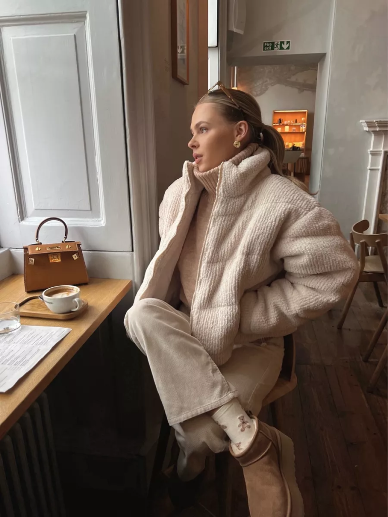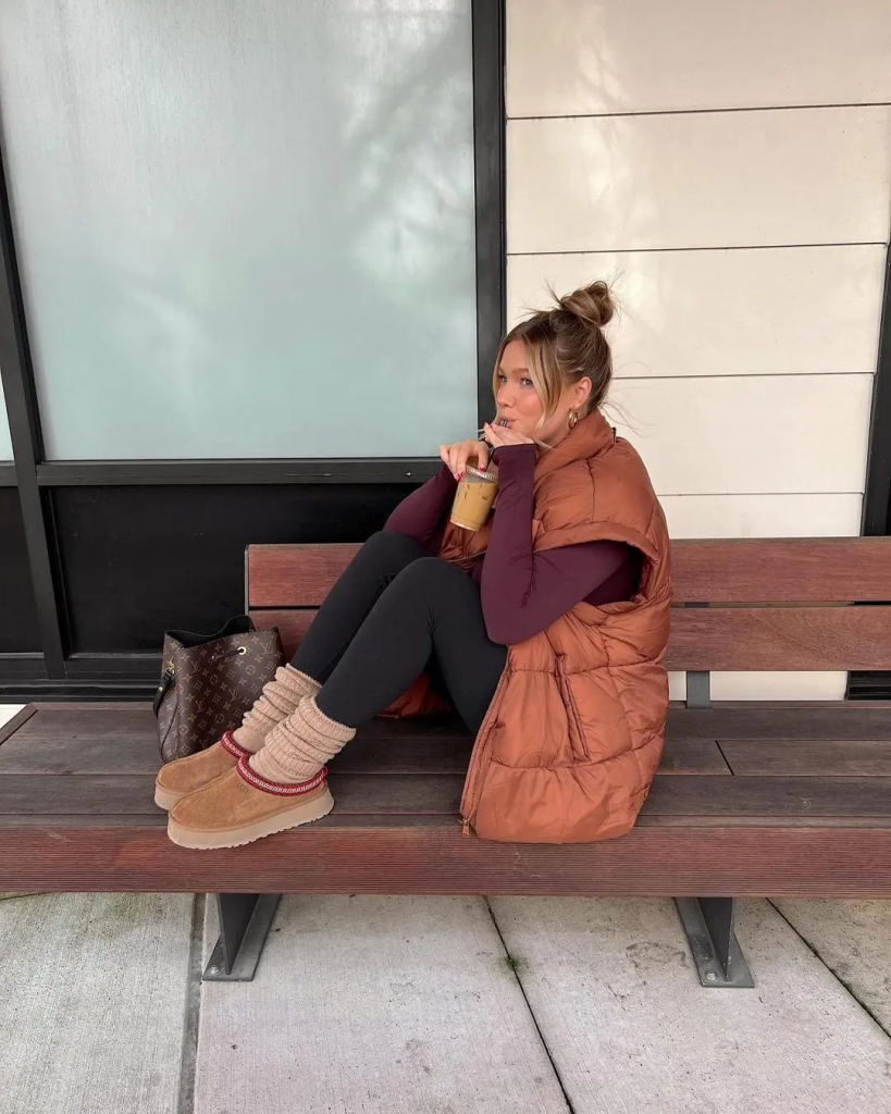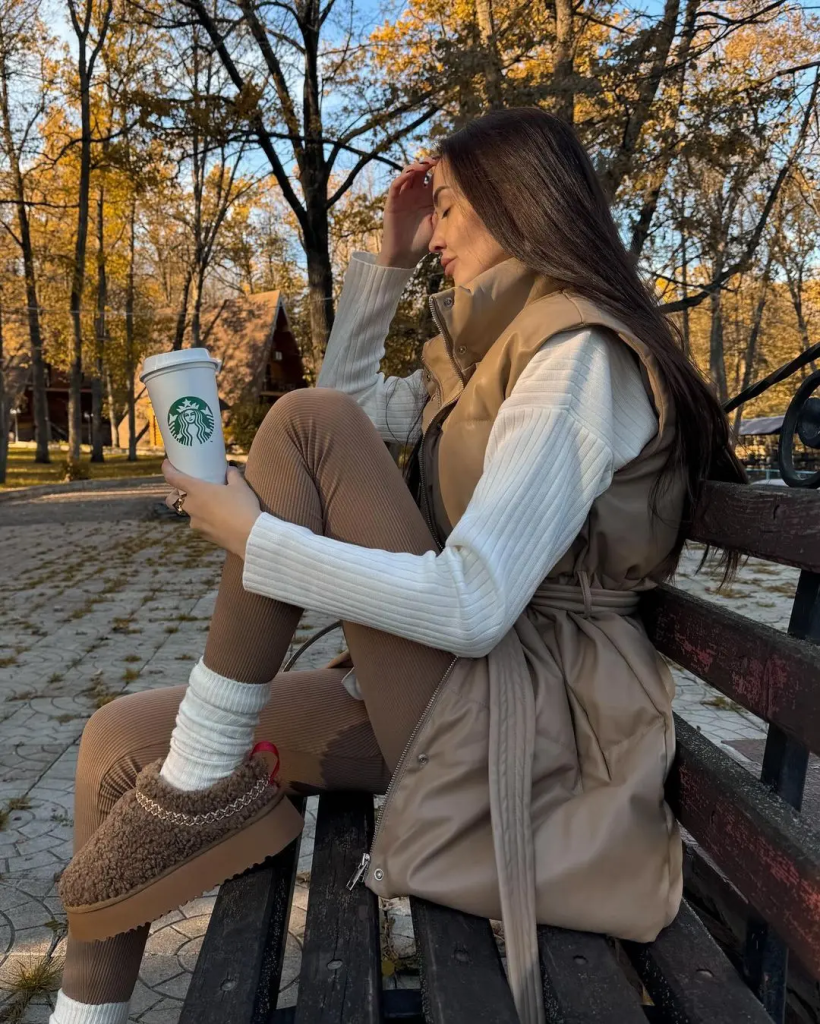 This look is so warm and cozy! The beige puffer vest over a white ribbed sweater paired with matching ribbed pants and teddy UGG slippers creates the perfect fall layering combo. Ideal for a peaceful morning walk or coffee run.
