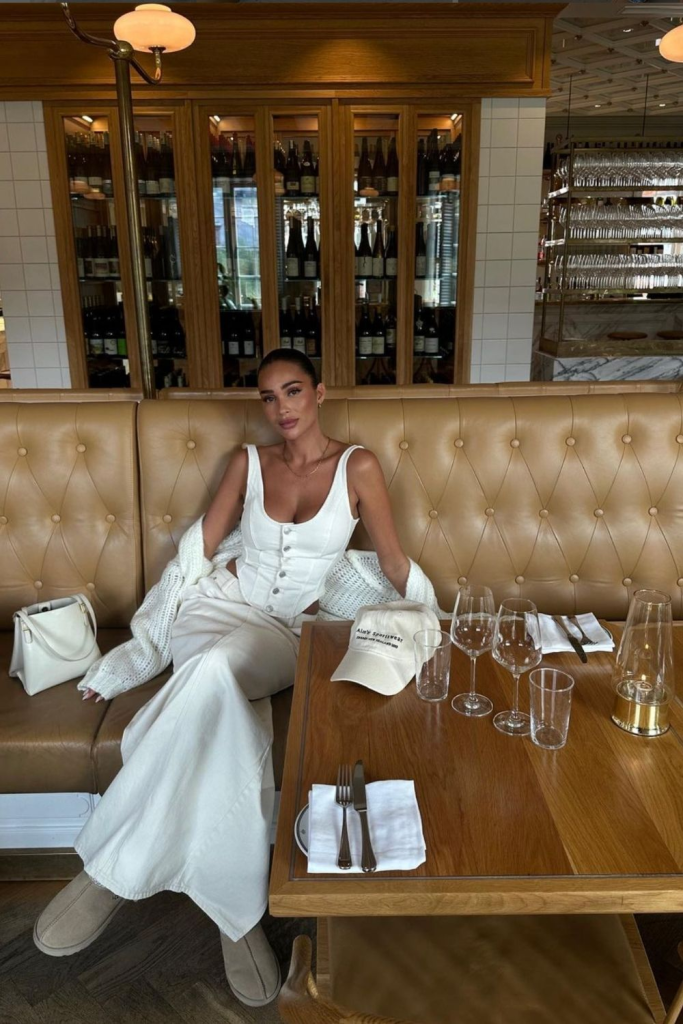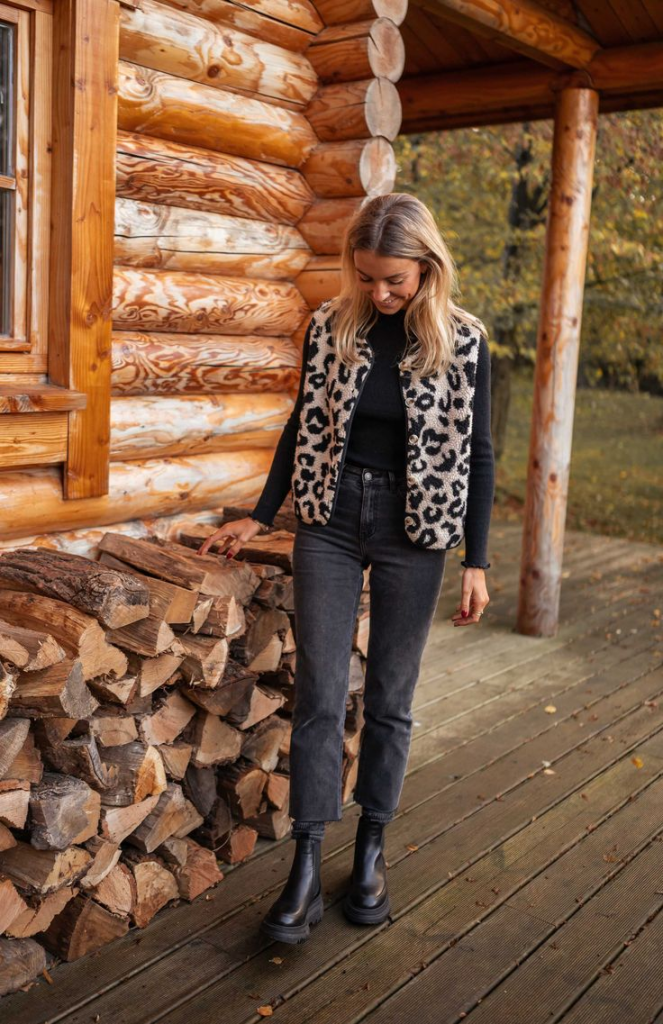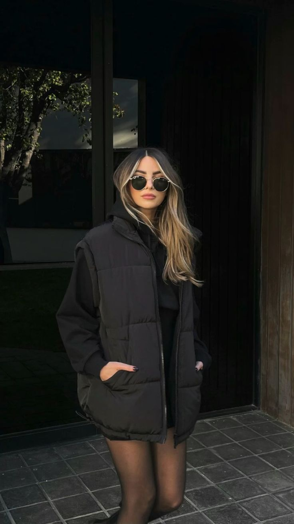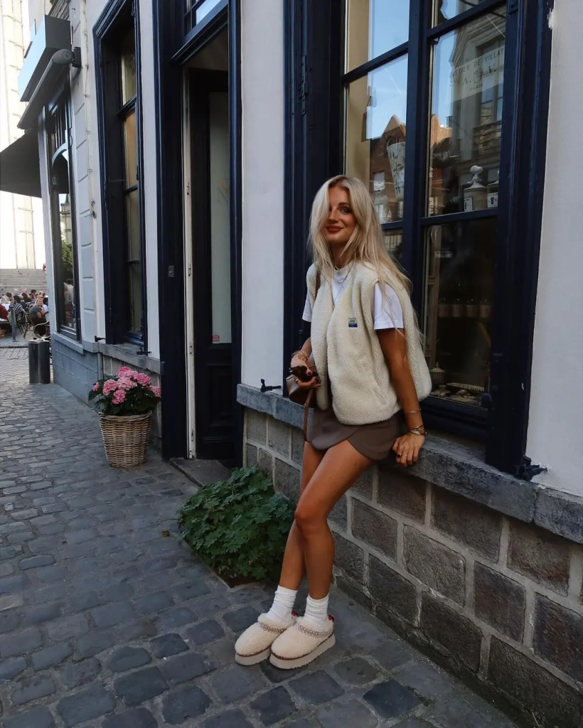 This look is perfect for those early fall days! The sherpa vest over a simple tee keeps it light, while the mini skirt adds a playful touch. Paired with cozy UGG slippers and socks, it’s ideal for a casual day of strolling through the city or grabbing lunch with friends. Super cute and laid-back!