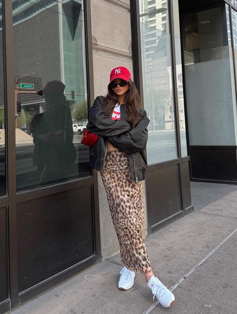 I love this oversized sweater tucked into a long denim skirt, paired with UGG slippers for a laid-back, yet stylish look. The cap and slouchy socks add an extra casual touch, making this a great outfit for running errands or enjoying a coffee outdoors.