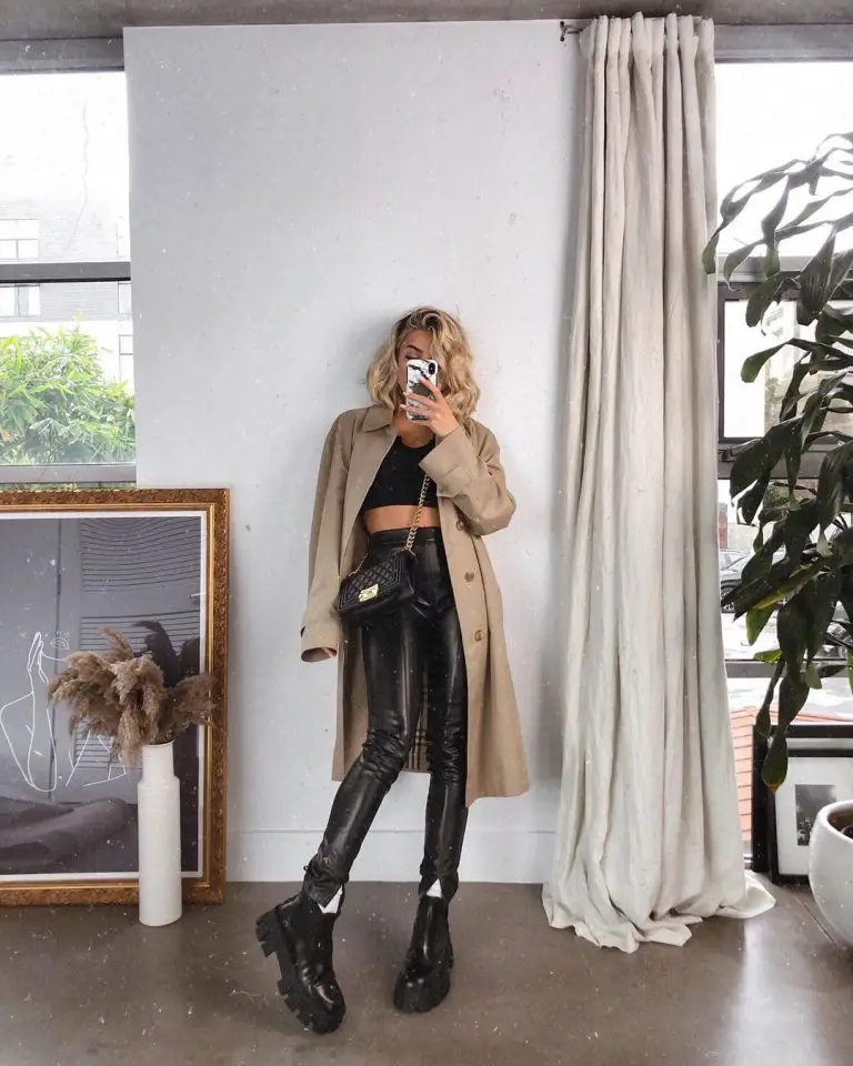 This timeless trench coat layered over an all-black outfit exudes effortless sophistication. The wide-leg trousers and black turtleneck create a sleek, elongated silhouette, while the belted waist adds definition. Paired with a quilted crossbody bag and round sunglasses, this look strikes the perfect balance between classic and contemporary, making it ideal for both professional and casual outings.