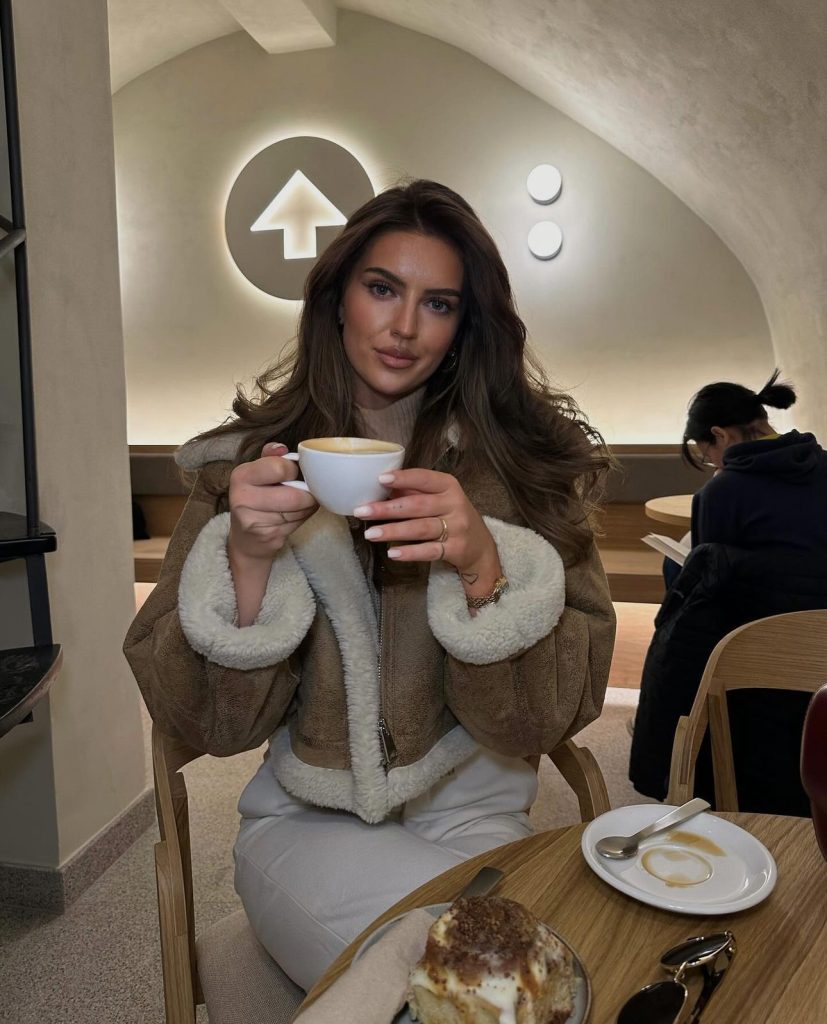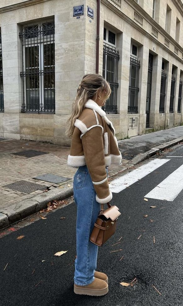 This shearling jacket with dark jeans and UGG slippers is such a comfy and stylish combo! Perfect for sipping on your favorite hot drink while staying cozy. The neutral tones make it a great everyday look for fall or winter.