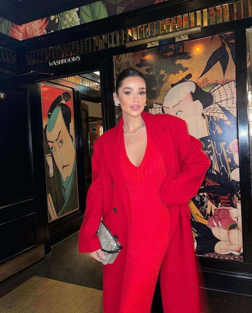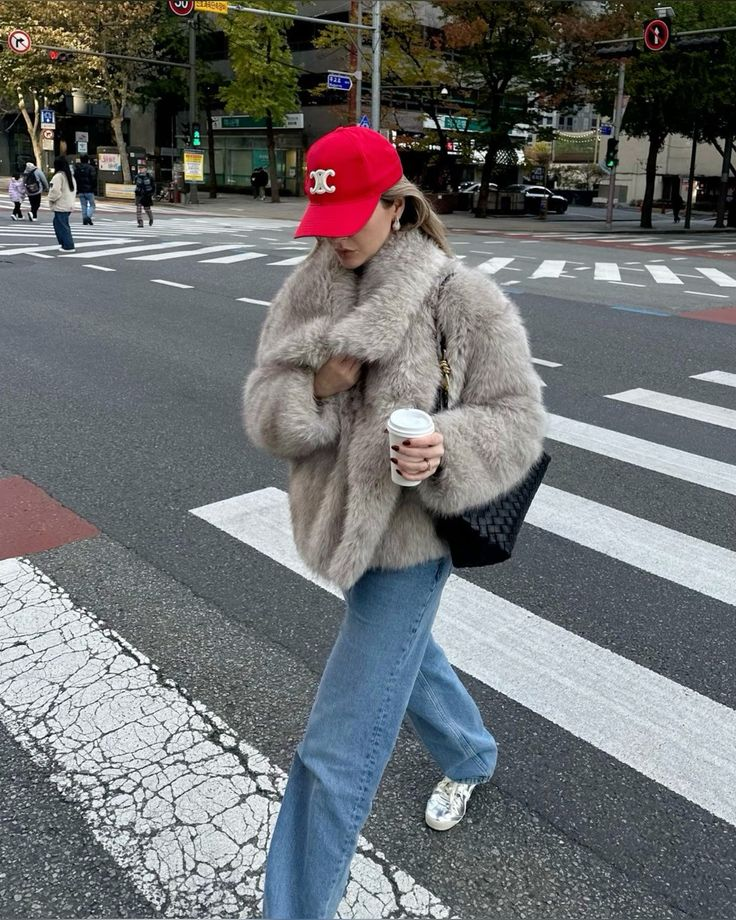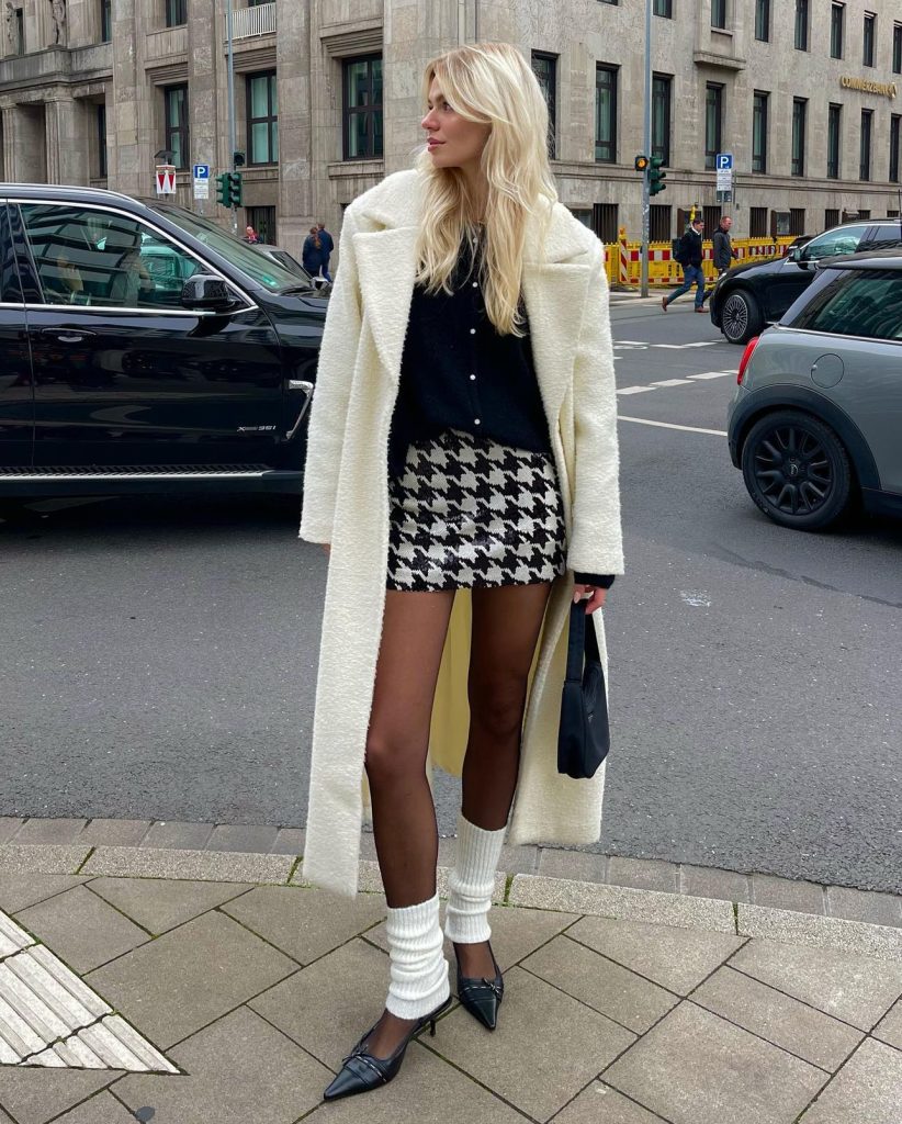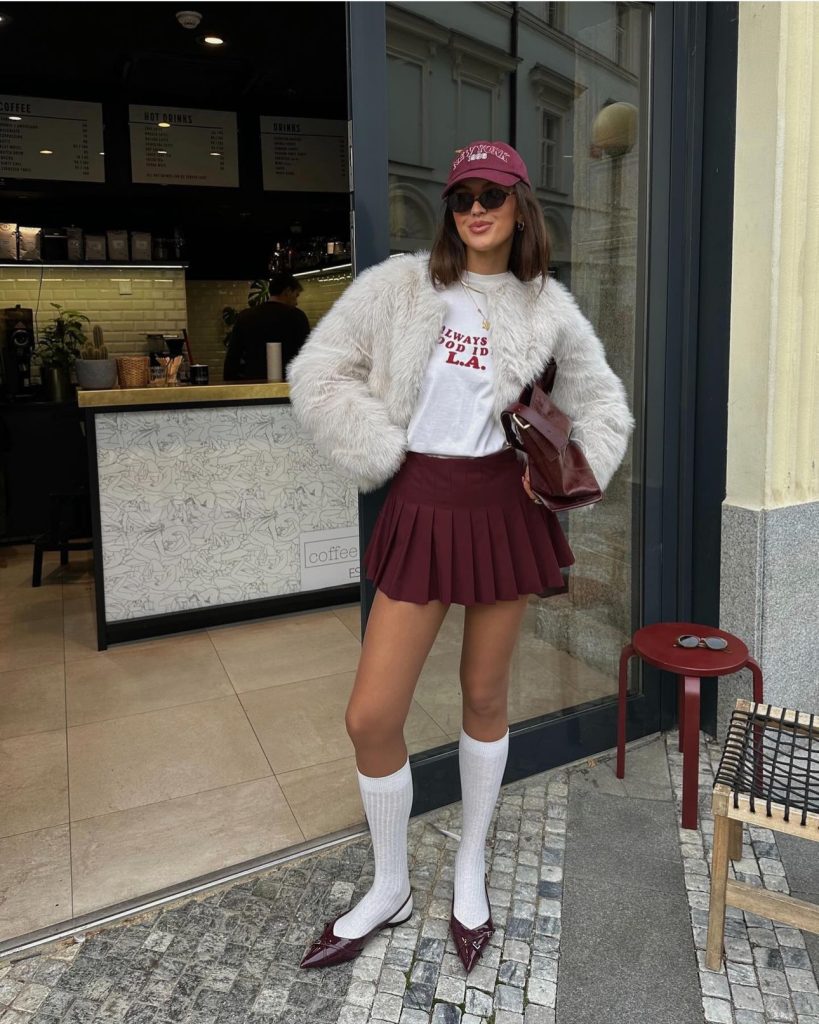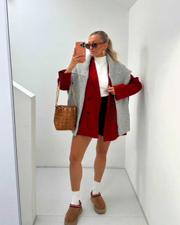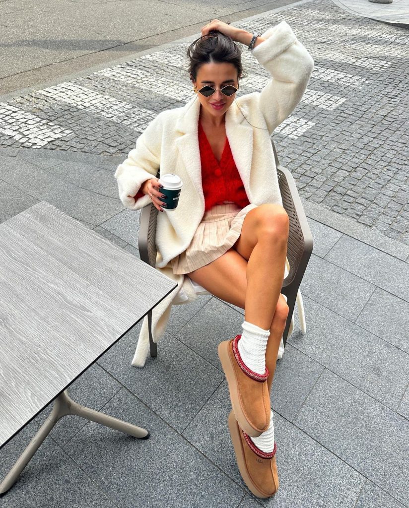 This chic white coat layered over a bold red sweater and pleated skirt gives a perfect balance of cozy and cute. Paired with UGG slippers and socks, it’s a great outfit for those in-between weather days when you still want to make a statement!