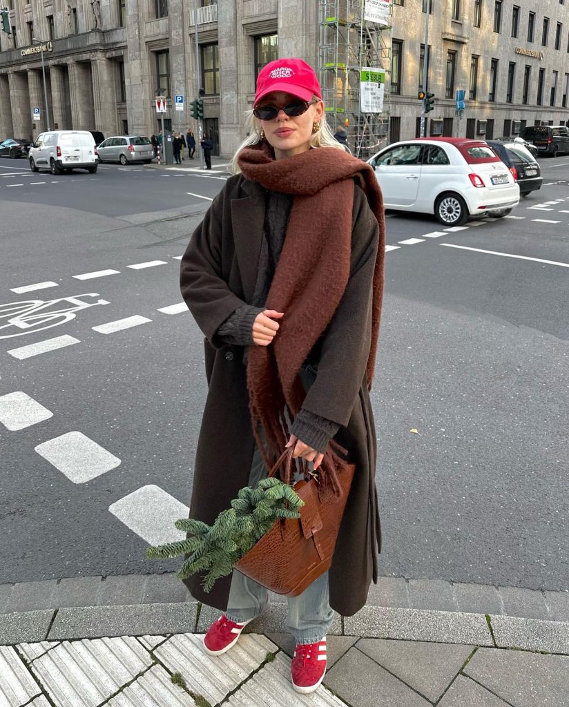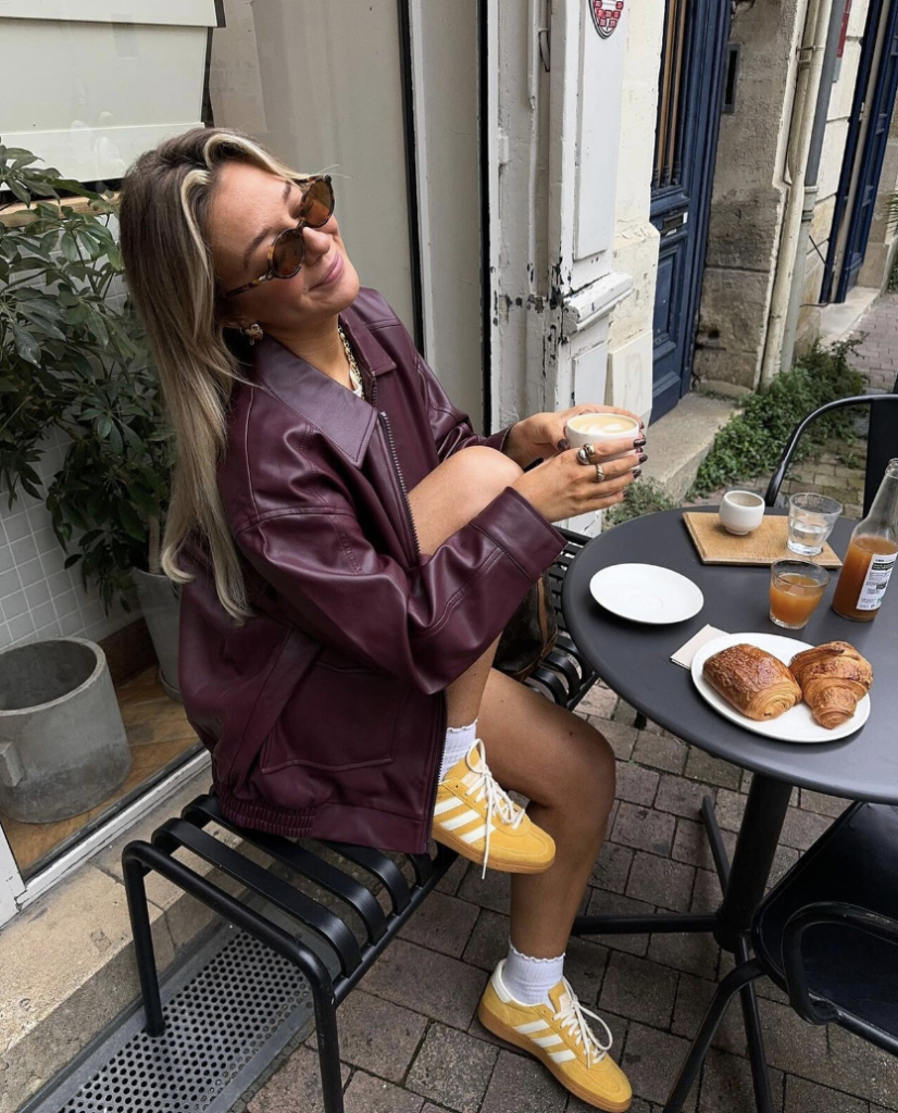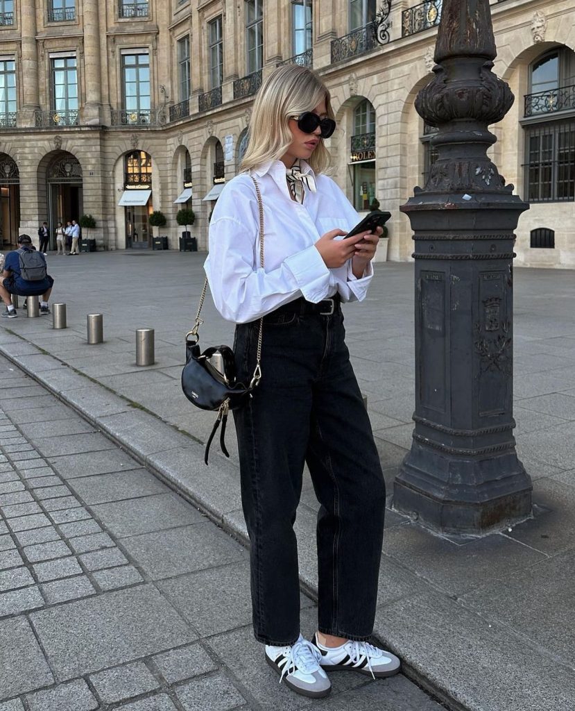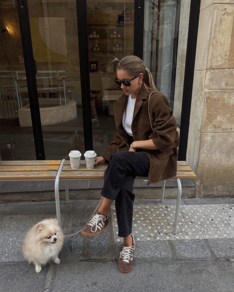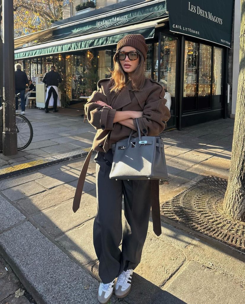 Neutral sneakers are an absolute must when it comes to nailing that effortless Parisian style. They blend seamlessly with any outfit while keeping things comfortable and casual. In this look, the neutral-toned Adidas Sambas are the top choice for most fashion girls right now, and it’s easy to see why. They pair perfectly with the classic trench coat and wide-leg trousers, giving off a laid-back yet polished vibe. These sneakers are ideal for city strolls or weekend errands while still looking chic. Plus, they’re versatile enough to wear with just about anything, from dresses to jeans.
