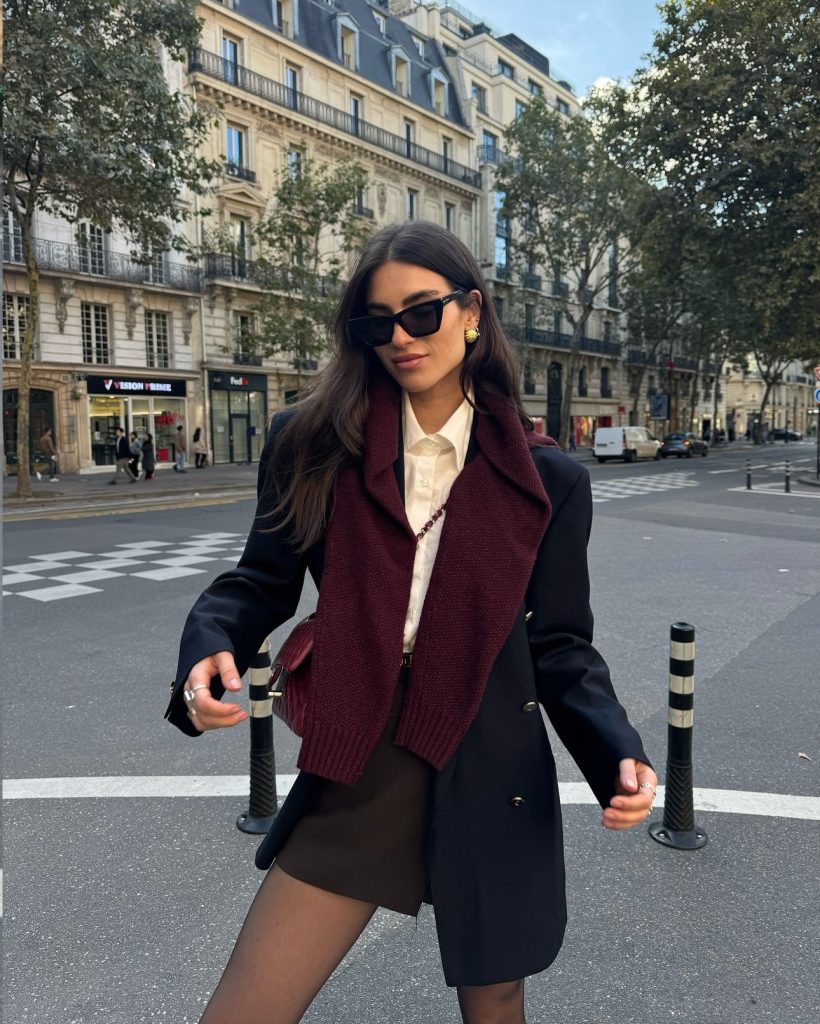 An oversized dress shirt is a staple of effortless Parisian style, and it’s all about that perfect balance between casual and polished. In this look, the crisp white shirt serves as the ideal base layer for a sleeveless sweater, giving off a vibe that’s both relaxed and chic. It’s versatile enough to dress up or down, and you can easily style it with skirts, trousers, or even as a dress like here. The oversized fit adds a modern twist, making it feel fresh and sophisticated at the same time.