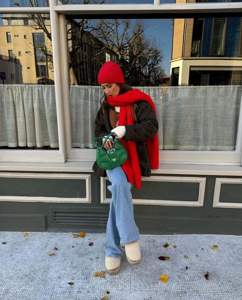 The oversized brown coat and green sweater with light jeans and tan UGG slippers make for a chic fall look. The pop of red from the bag adds just the right touch of color! Perfect for a crisp autumn walk through the city.