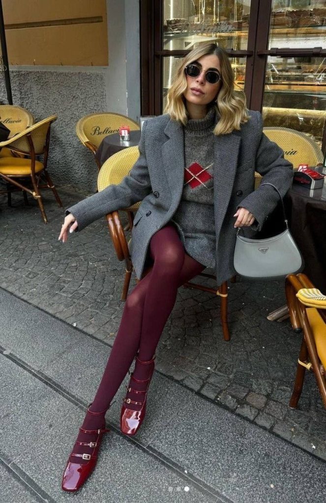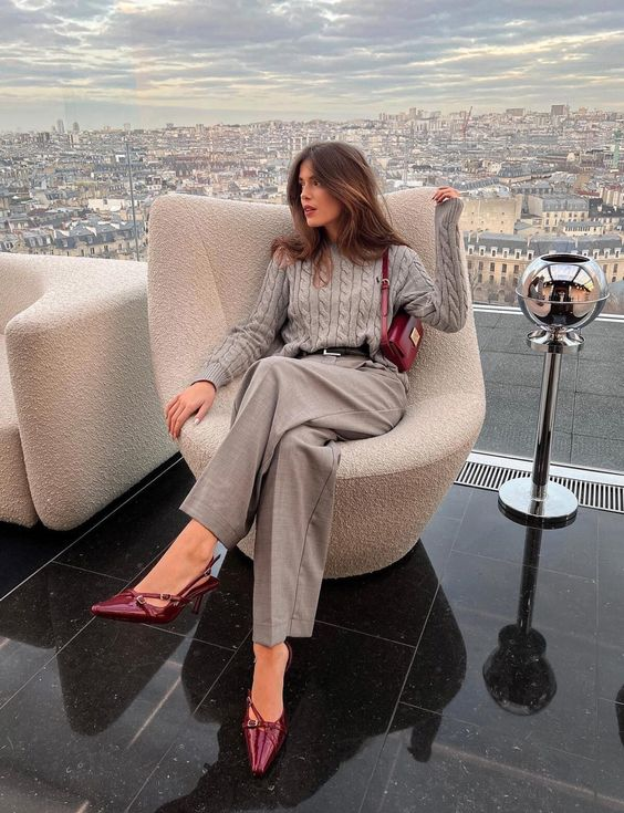 A perfect blend of cozy and professional, this cable knit sweater paired with sleek tailored trousers brings a fresh take to business casual. The soft grey tones keep the outfit sophisticated, while the burgundy slingback heels and matching bag add a bold pop of color. It’s an ideal look for those cool autumn days when you want to stay warm but still make a style statement.