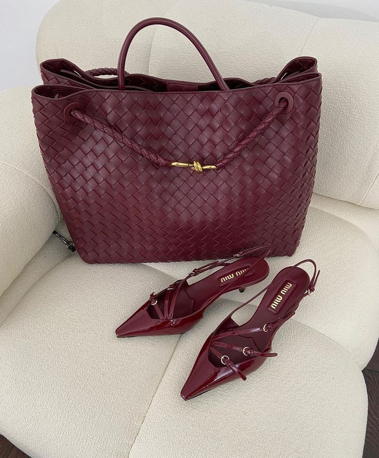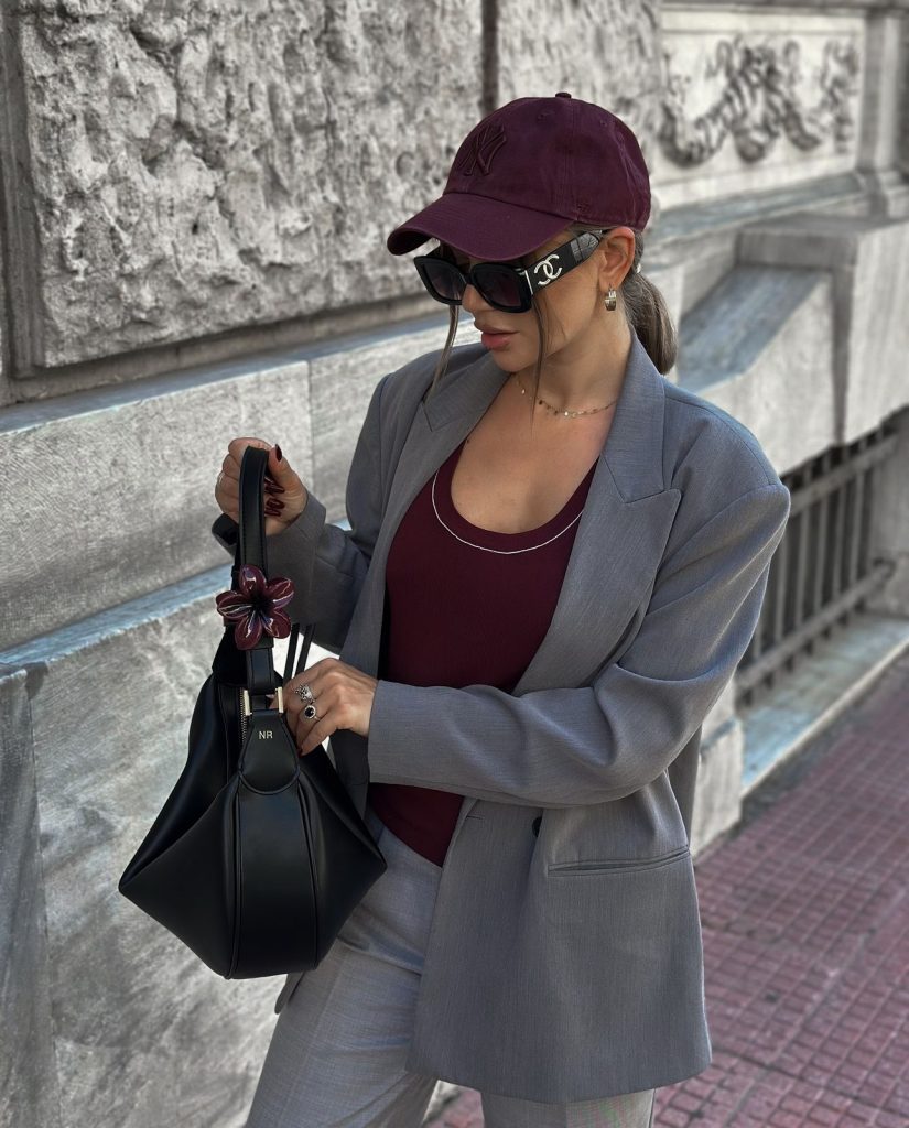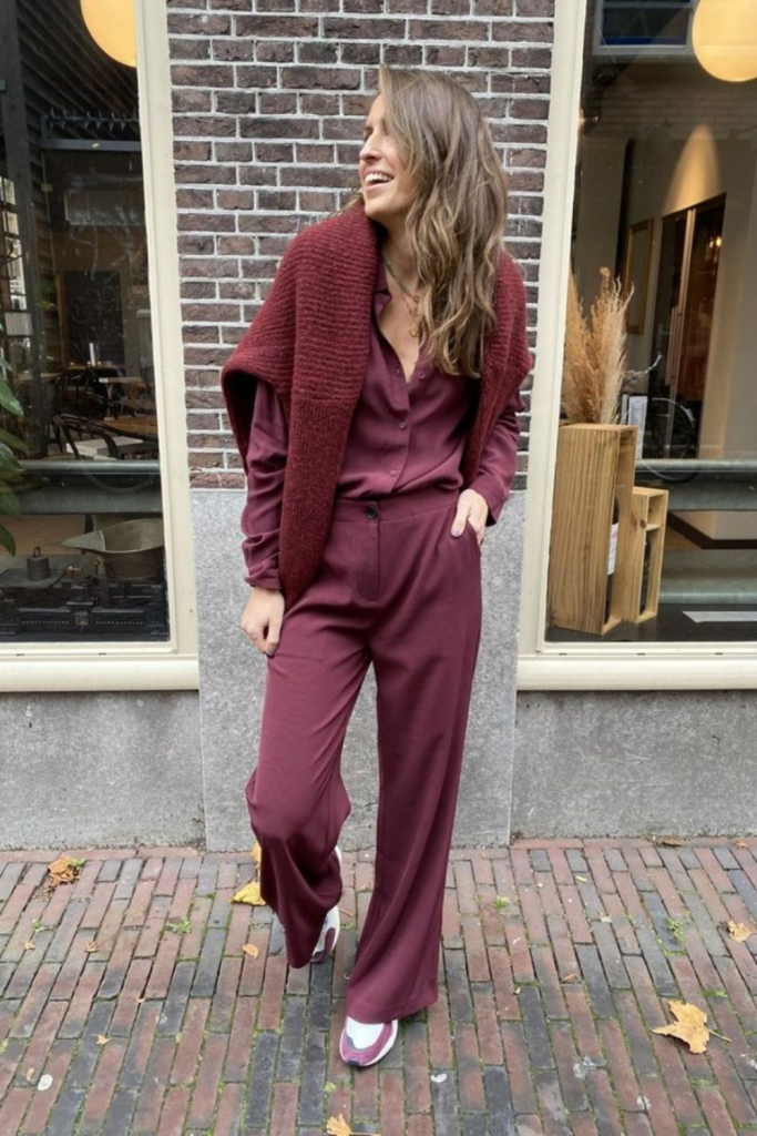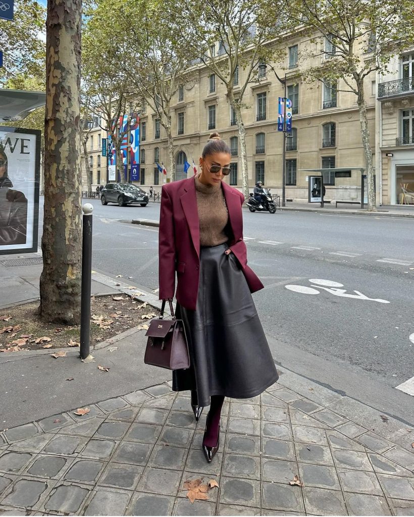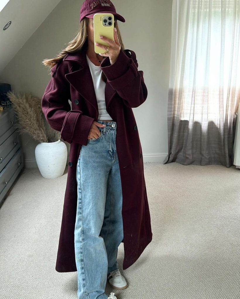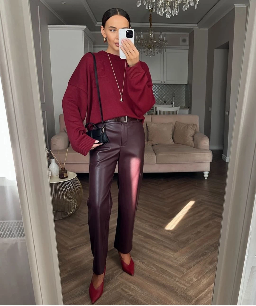 This look radiates sophistication with a rich burgundy coat that adds depth and elegance to the outfit. Paired with neutral wide-leg trousers for a balanced silhouette, the burgundy shoes and heart-shaped bag add a playful yet refined touch. Perfect for cooler fall days, this ensemble is both stylish and comfortable, making it ideal for any business casual or day-to-night transition.