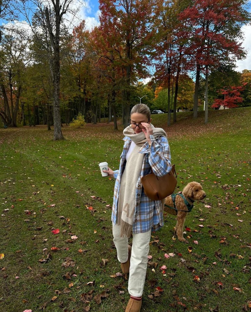 This plaid shirt layered with a cozy scarf and white jeans is the ultimate fall look for a walk in the park with your furry friend! The UGG slippers add an extra touch of warmth and comfort, making it perfect for a crisp autumn day.