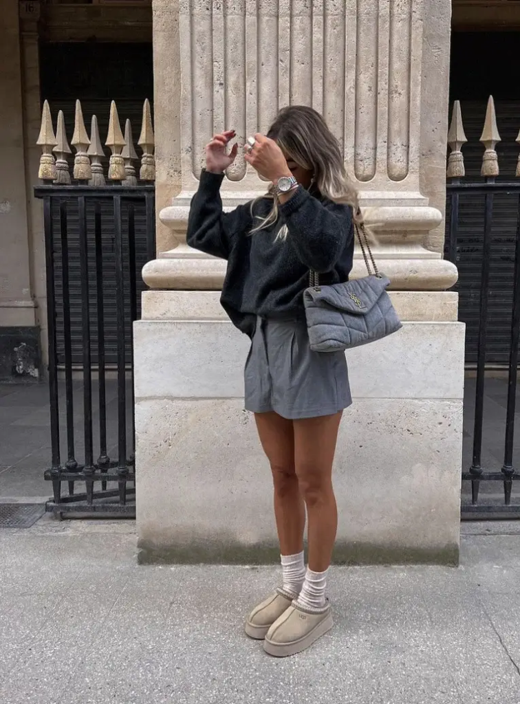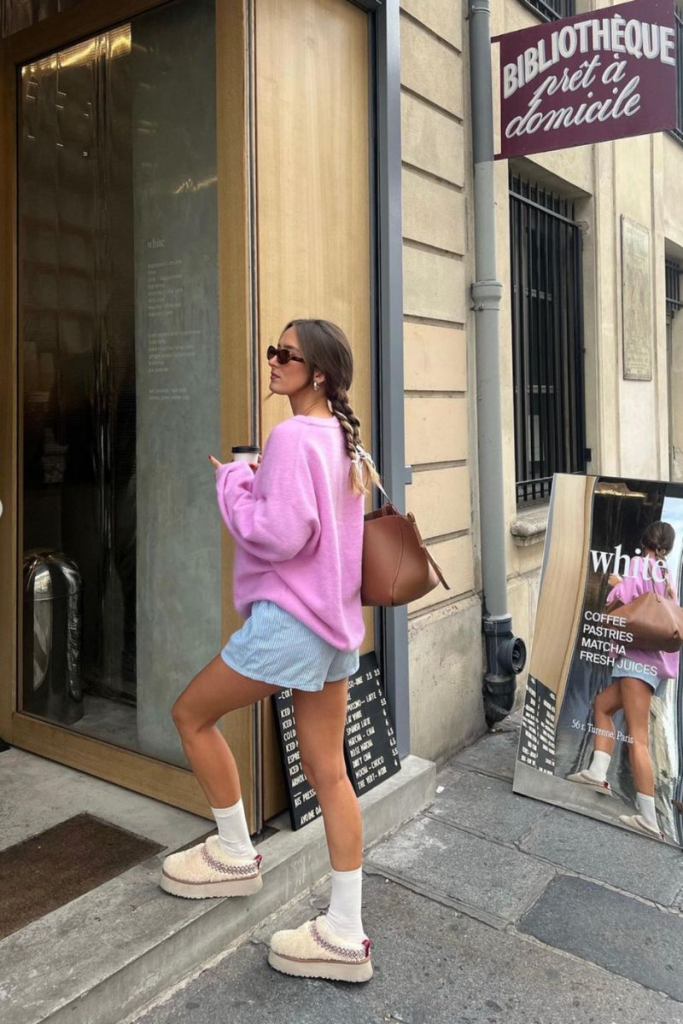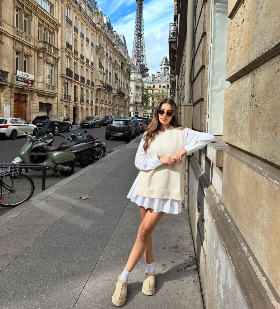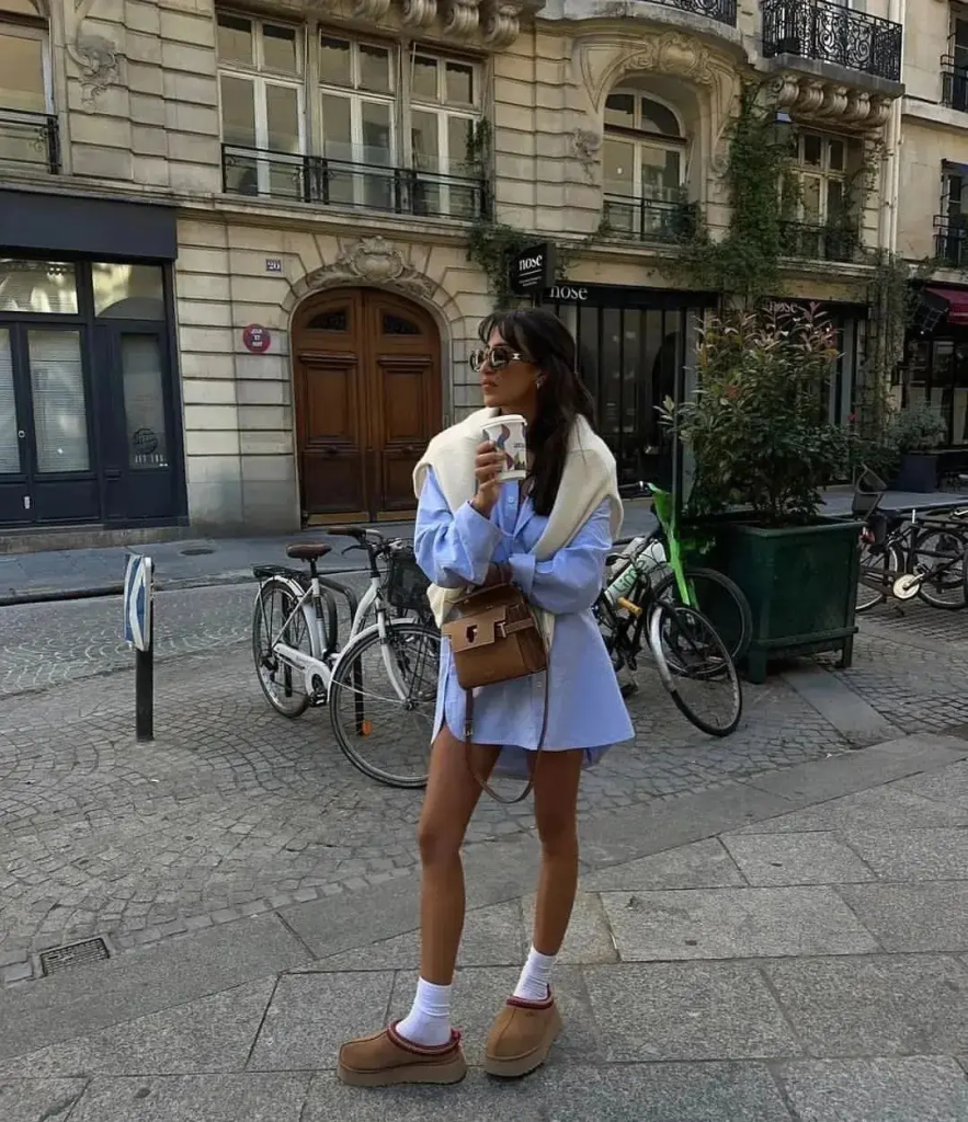 This oversized shirt dress paired with UGG slippers and a sweater draped effortlessly over the shoulders gives off chic Parisian vibes. This outfit is perfect for a stylish stroll through the city or grabbing brunch with friends.