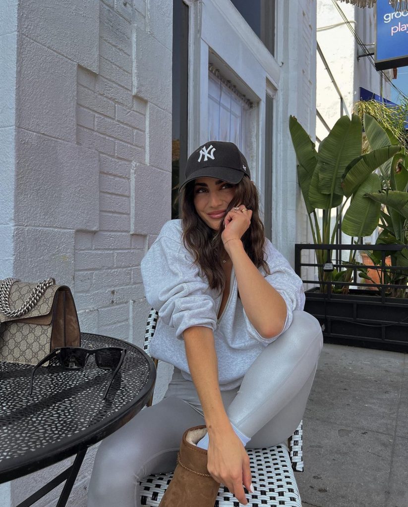 I’m obsessed with the comfy vibes of this gray hoodie paired with silver leggings and chestnut UGG slippers. This is such an easy go-to look for a casual coffee date or a quick lunch with friends. The baseball cap gives it a sporty, laid-back feel!
