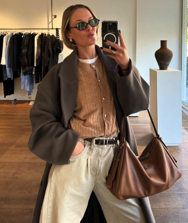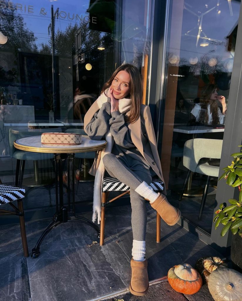 This cozy matching gray sweatsuit with a camel coat and UGG slippers is the perfect blend of casual and classy. Whether you’re grabbing a coffee or relaxing at a café, this look keeps you warm while still feeling super put-together.