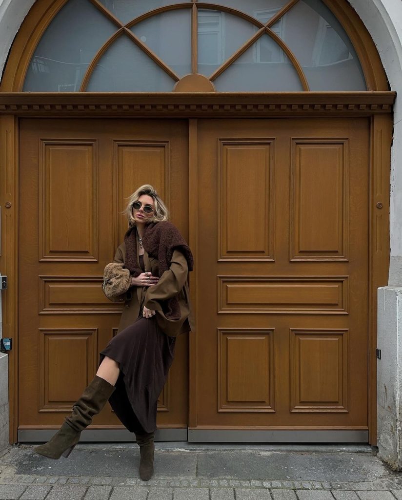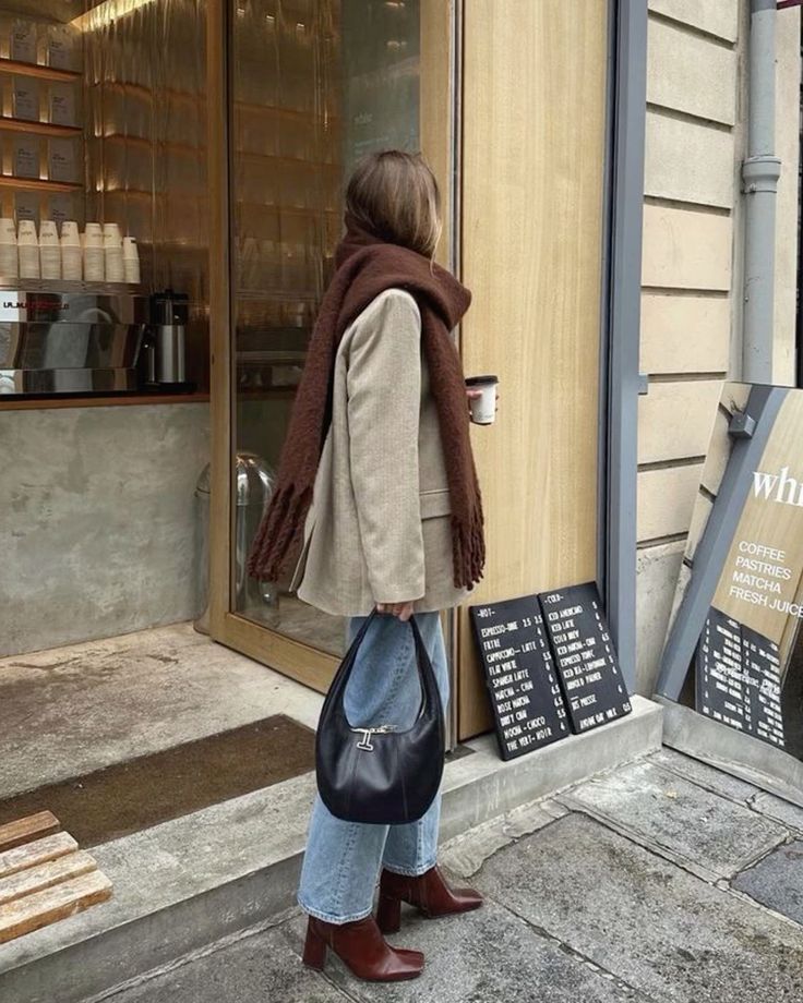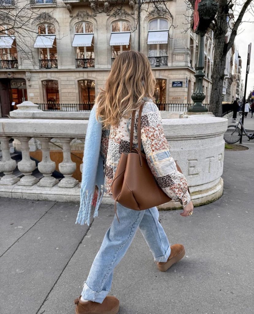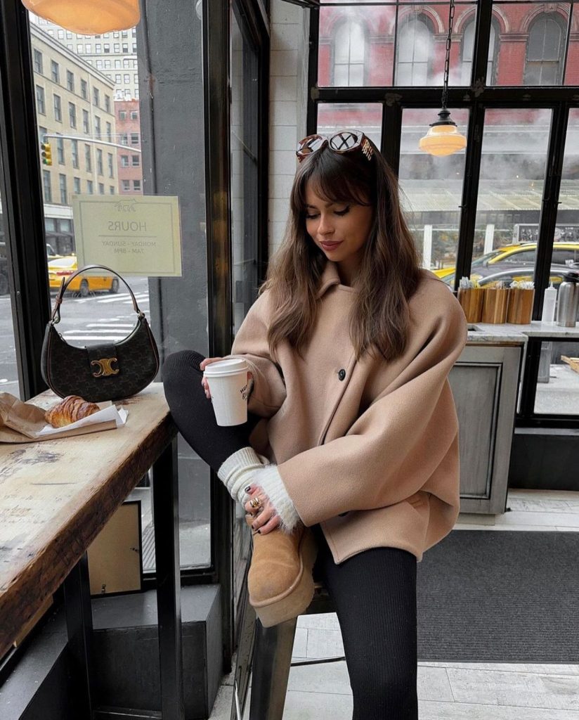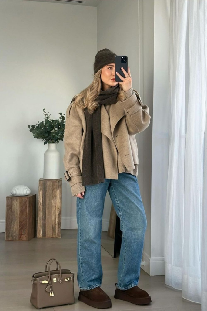 The layered beige coat and scarf with wide-leg jeans and dark UGG slippers is the perfect blend of warmth and style. This look is so chic for a winter day out—grab your favorite handbag, and you’re ready to go!