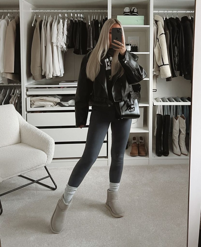 This look is such a vibe! The sleek black leather jacket with classic black leggings gives off that “effortlessly cool” energy that I can’t get enough of. I love how it’s both edgy and simple at the same time—ideal for when you’re feeling a little rebellious but still want to stay comfy.