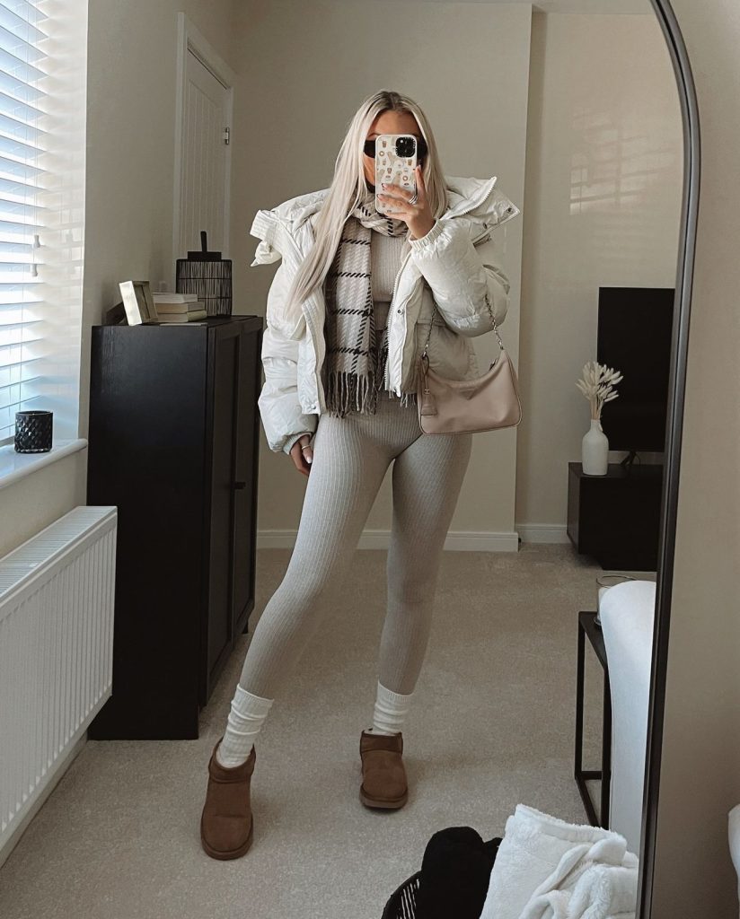 This outfit gives off all the cozy winter feels! The oversized white puffer jacket paired with ribbed leggings is a classic combo that screams both comfort and style. The plaid scarf adds a bit of pattern to the neutral tones, making the whole look feel elevated and chic. It’s the perfect outfit for staying warm while still looking put together for those cold morning coffee runs or casual weekend strolls. I’m definitely obsessed with how simple yet stylish this one is!