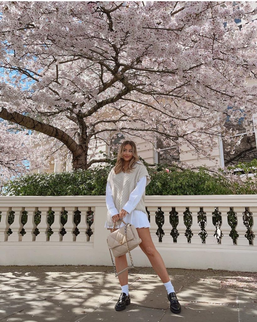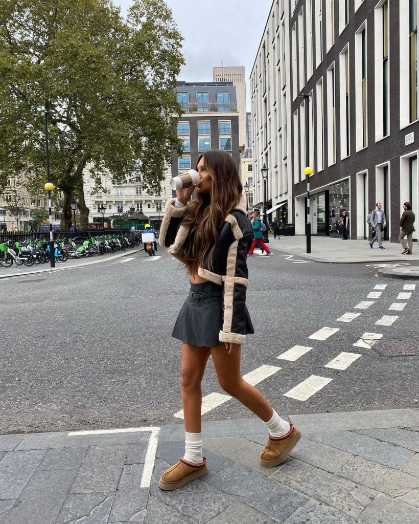 Oh, I love this fit! The cropped sherpa jacket adds the perfect touch of warmth while still looking trendy, and the pleated mini skirt gives it that flirty, street-style vibe. It’s one of those looks that feels effortlessly cool yet totally comfortable for a day out in the city. The layering with the cozy socks and casual vibe of the outfit make it ideal for grabbing a coffee on the go. Wouldn’t this be a perfect city look for a chilly fall day?