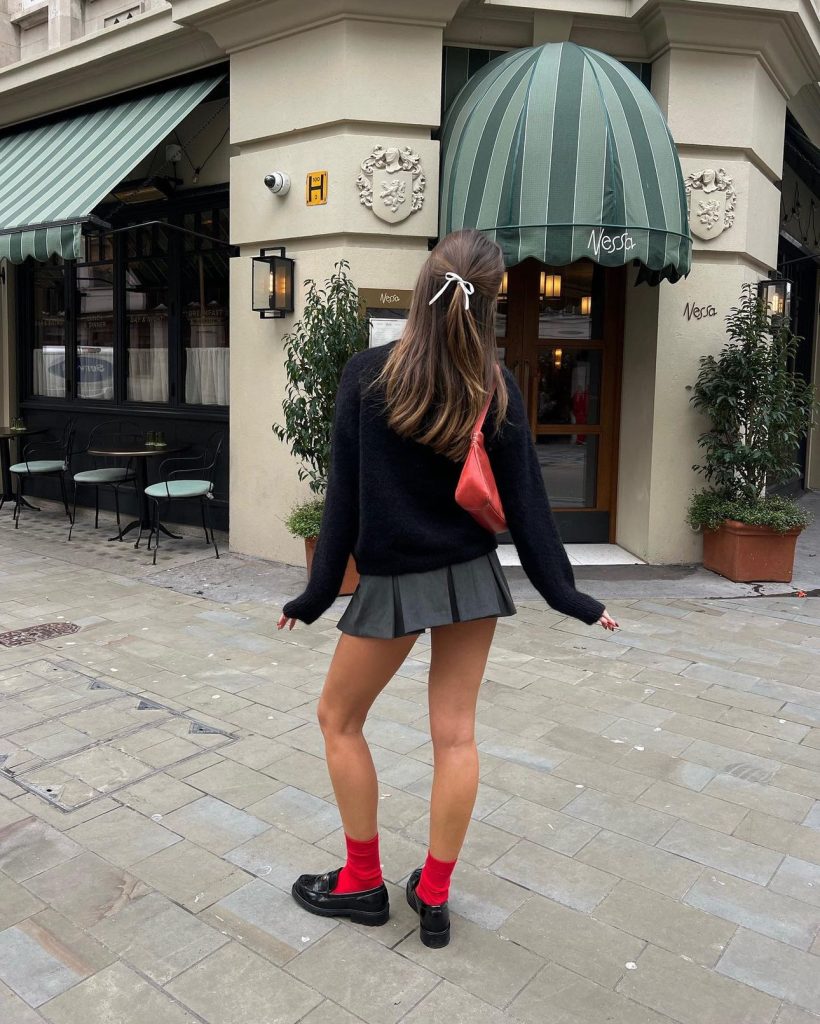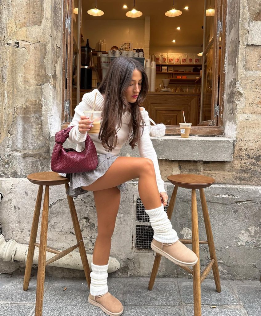 I’m completely in love with this chic café look! The mini pleated skirt paired with a snug turtleneck and soft leg warmers feels like the perfect mix of cute and cozy. It’s giving off major “effortless French girl” vibes, and that pop of color from the bag is just the right touch to keep it playful. Ideal for grabbing coffee in style while staying warm!