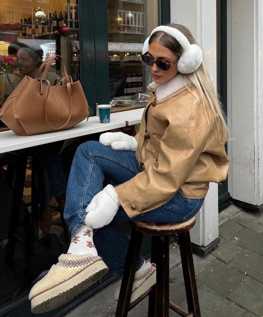 This cozy winter outfit is just too cute! The tan jacket with its fuzzy lining pairs perfectly with classic blue jeans, and the white earmuffs and mittens add a fun and warm touch. I’m loving the little details, like the patterned socks and fluffy slippers, which really pull the whole look together. It’s the perfect choice for a relaxed day out, grabbing a coffee or running errands—so comfortable yet still super chic!