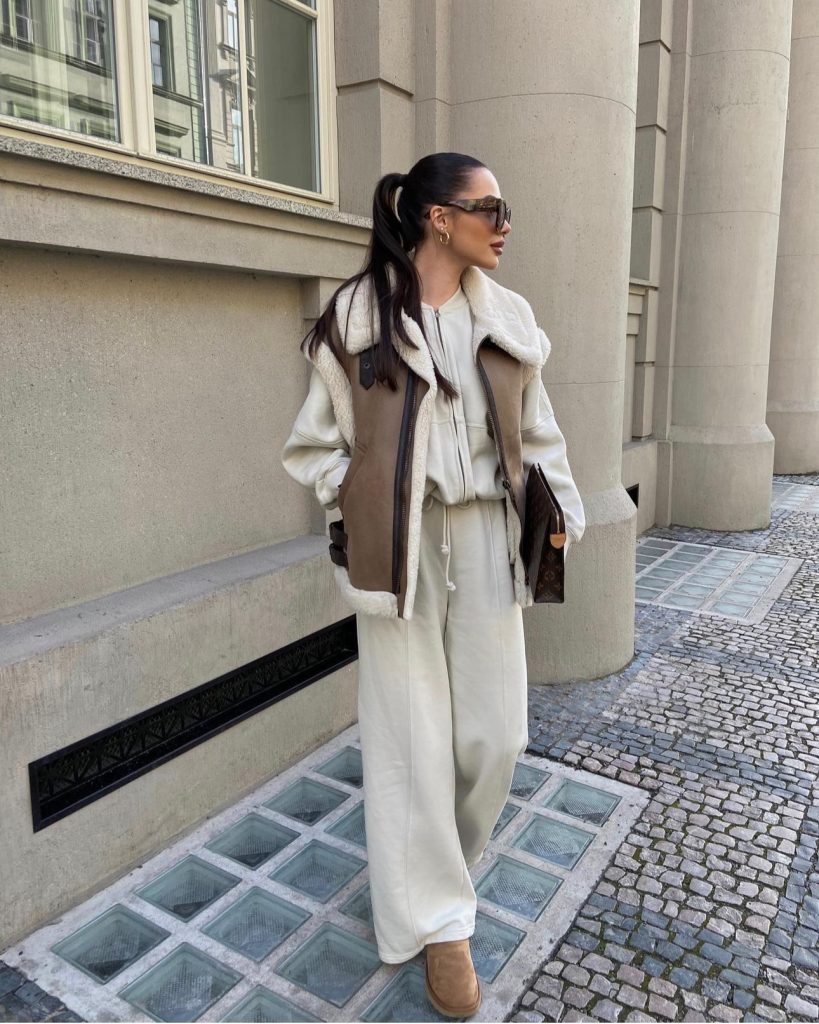 This look is all about luxe winter layering! The shearling vest over cream wide-leg trousers feels effortlessly chic, especially with the relaxed drawstring hoodie peeking out. It’s a perfect mix of laid-back and elevated, making it great for running errands or a casual city walk. The slicked-back ponytail and oversized sunglasses give off serious cool-girl vibes. Isn’t this look the perfect balance of cozy and stylish?