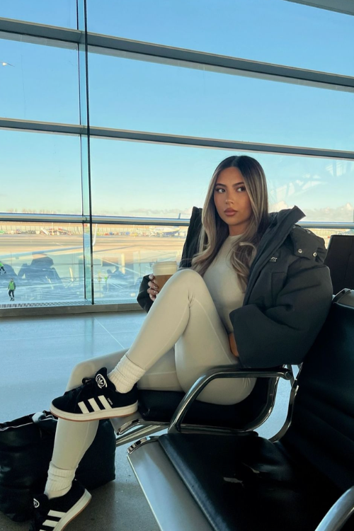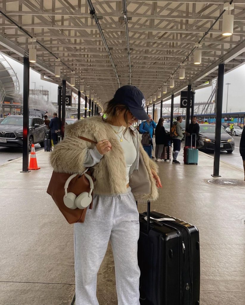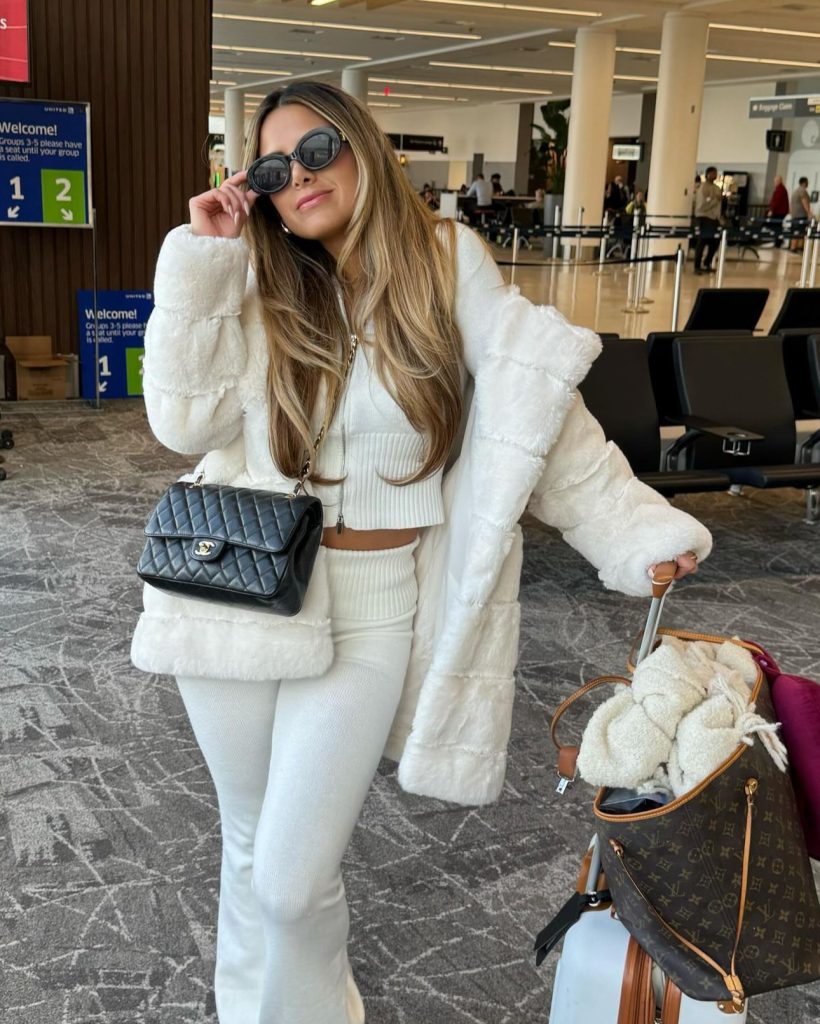 Travel in style with this head-turning all-white ensemble. The fur coat, cozy knit pants, and matching accessories make for a luxurious yet comfy airport look. Whether you’re headed to the lounge or boarding, you’ll be turning heads.
