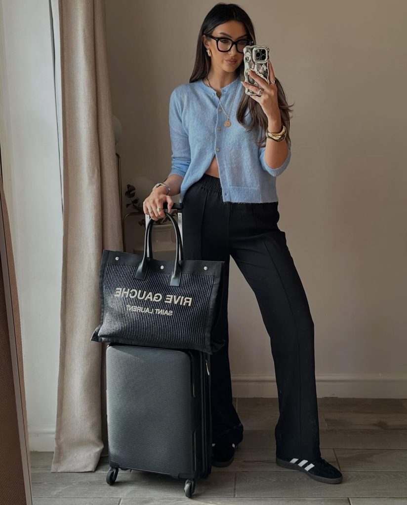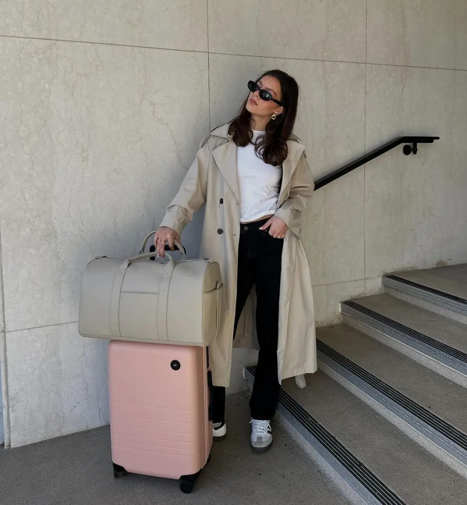 You can’t go wrong with a timeless trench coat paired with black jeans and white sneakers. This outfit is effortlessly chic and practical for navigating airport terminals in style. The oversized duffel and pastel pink suitcase make this look feel both functional and fun, with a touch of French girl sophistication.