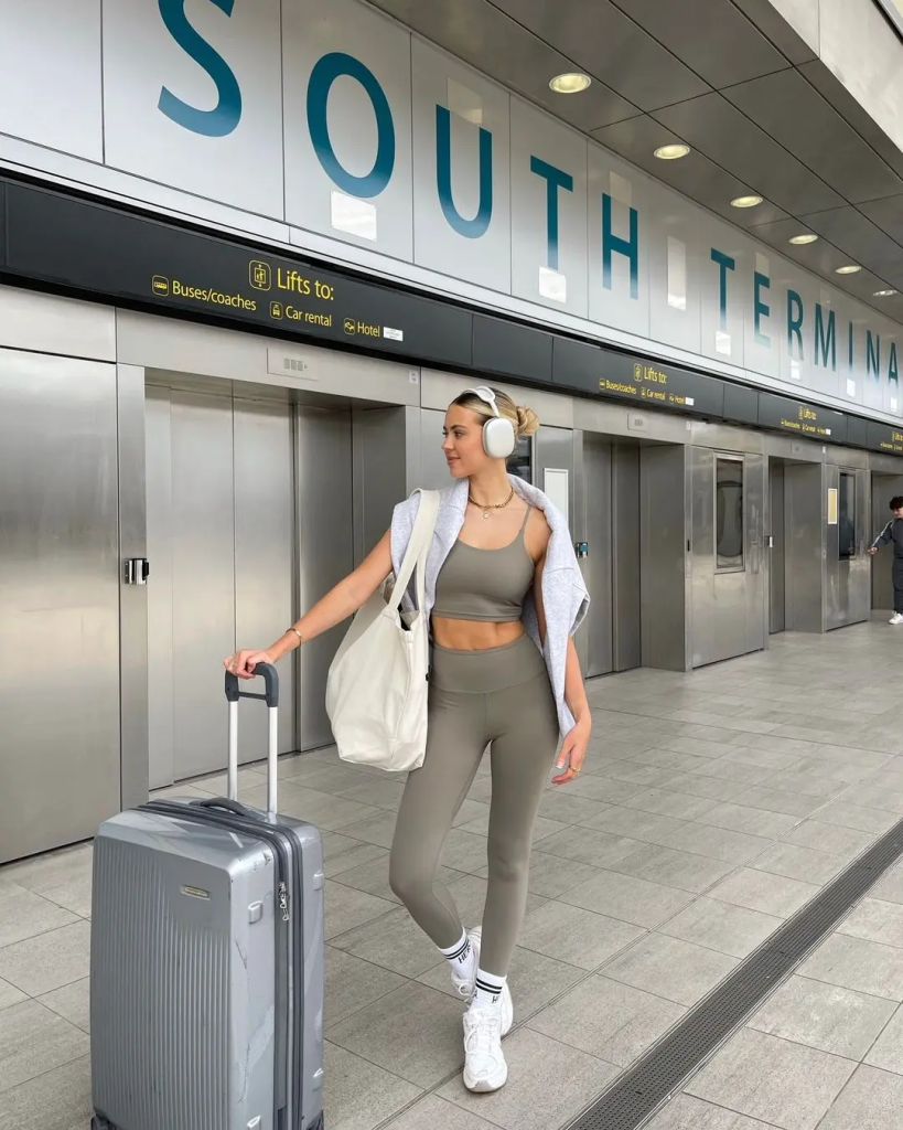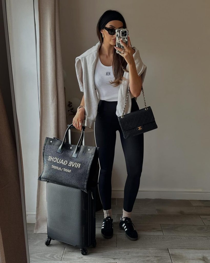 This laid-back look is the ultimate in comfort. Black leggings, a simple white tank, and a casual sweater draped over the shoulders are ideal for a no-fuss airport look that still feels pulled together.