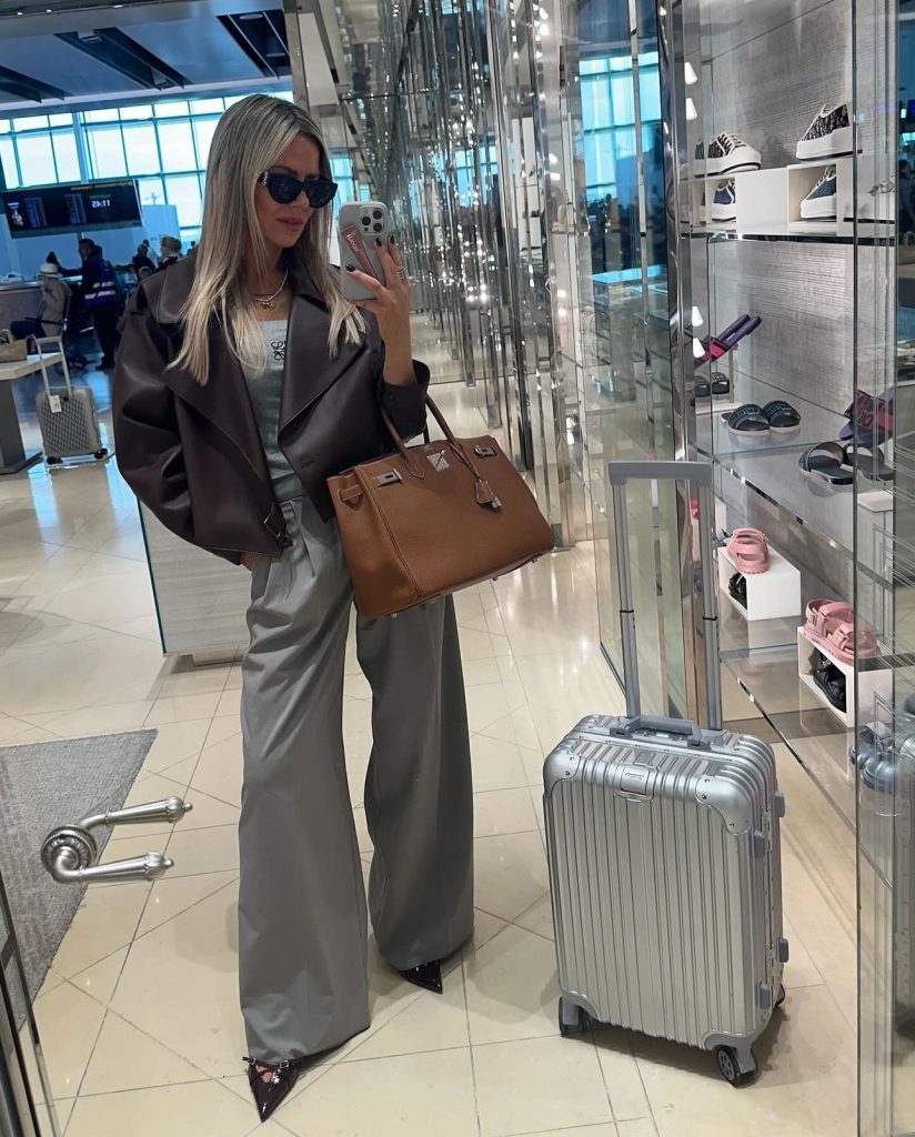 This look is all about relaxed luxury. A chocolate brown leather jacket paired with wide-leg gray trousers creates a sleek and sophisticated silhouette. The brown Birkin bag is a statement accessory that ties the outfit together beautifully. Perfect for the fashion-forward traveler who wants to look polished without sacrificing comfort.