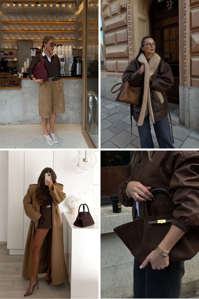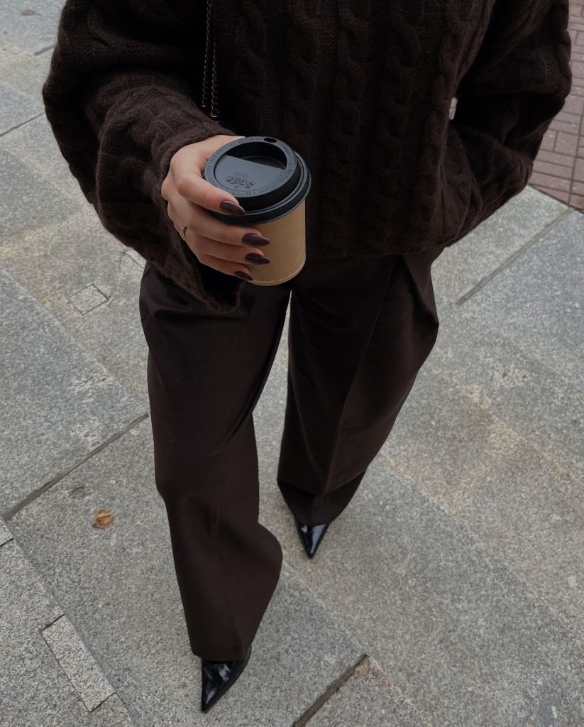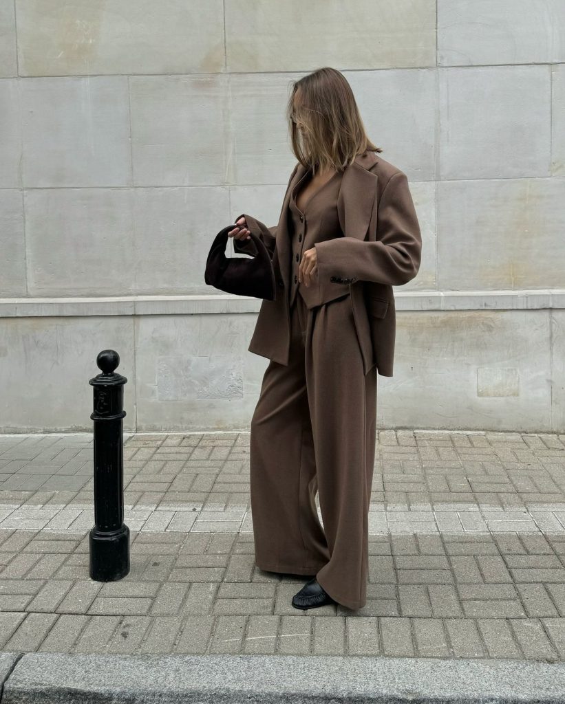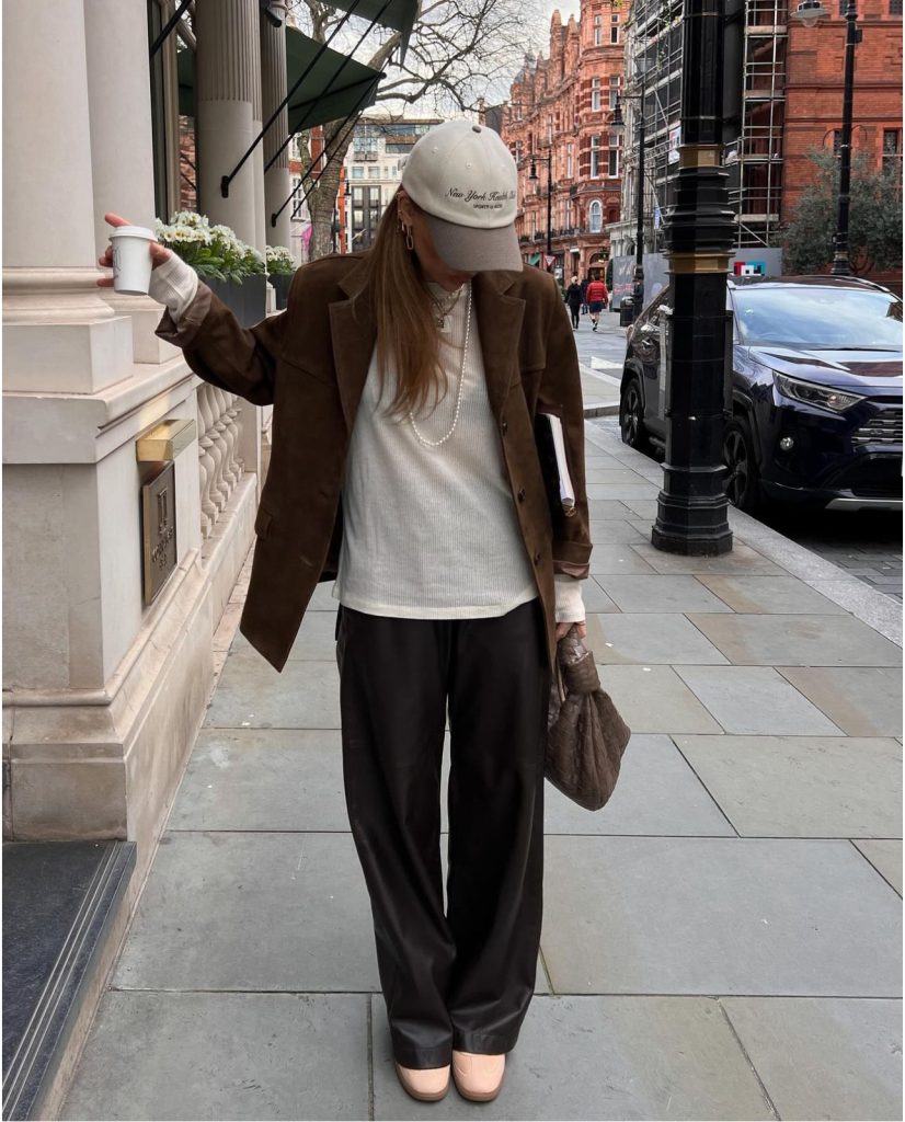 This chic monochrome moment features a fitted brown crop top paired with wide-leg trousers and an oversized brown leather jacket for a cozy, pulled-together feel. The suede bag, tortoiseshell glasses, and slicked-back bun add major old-money aesthetic vibes—ideal for a stylish coffee run or city errands.