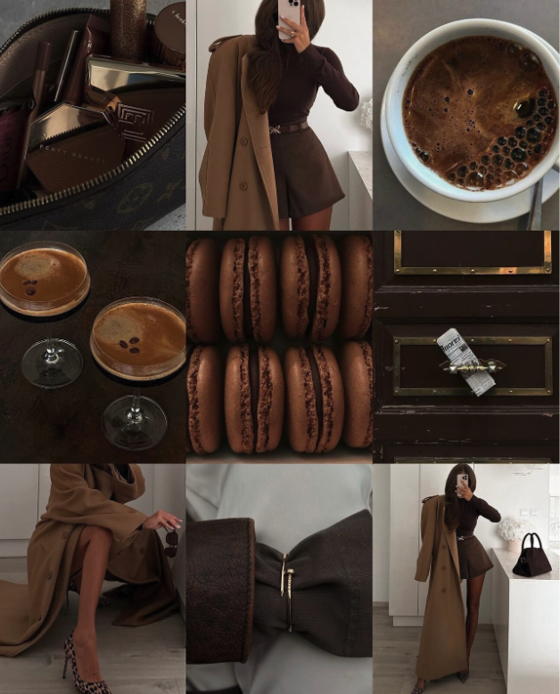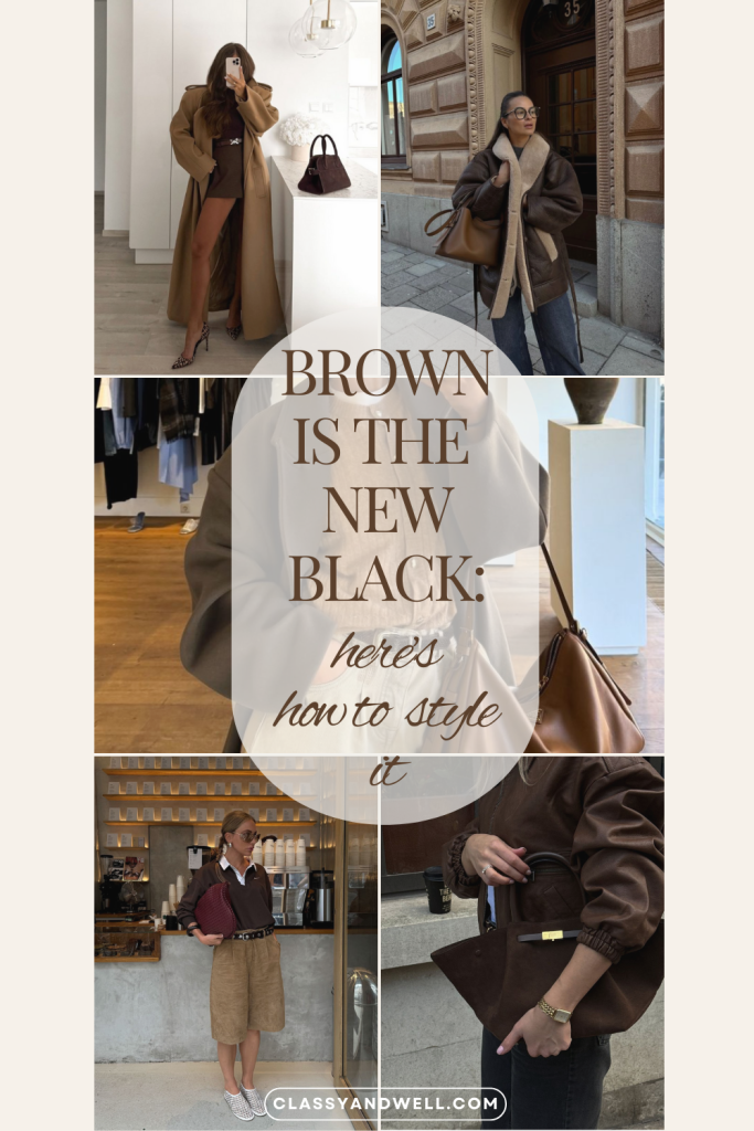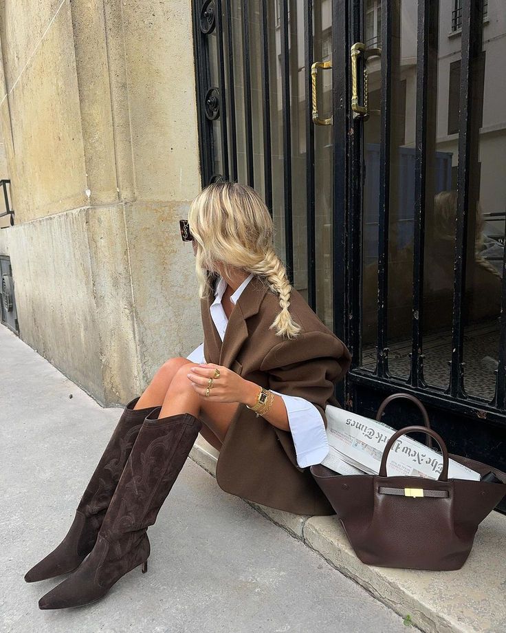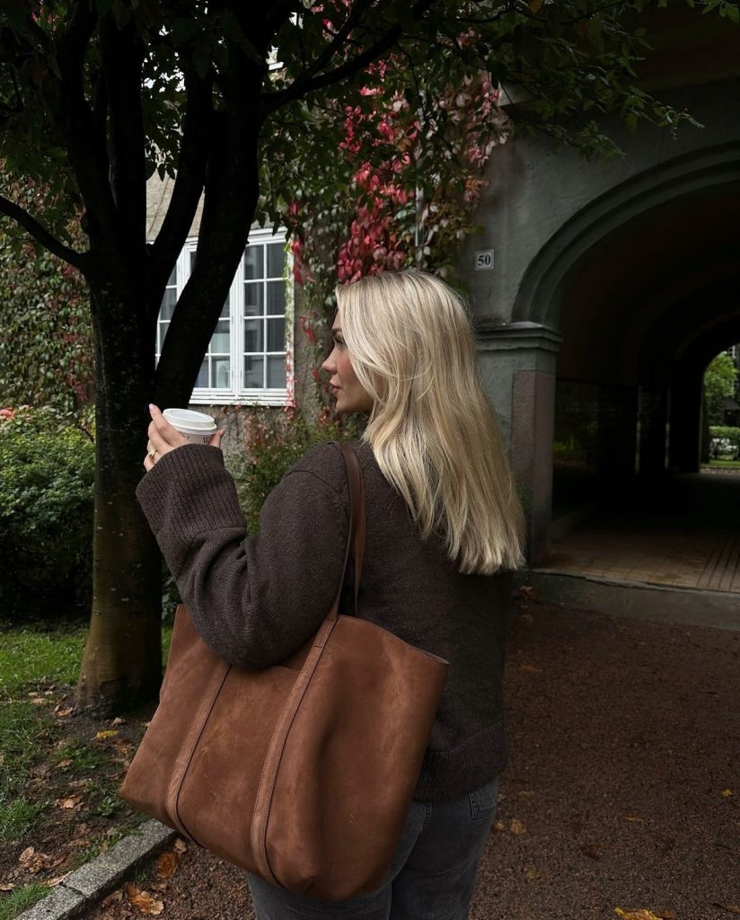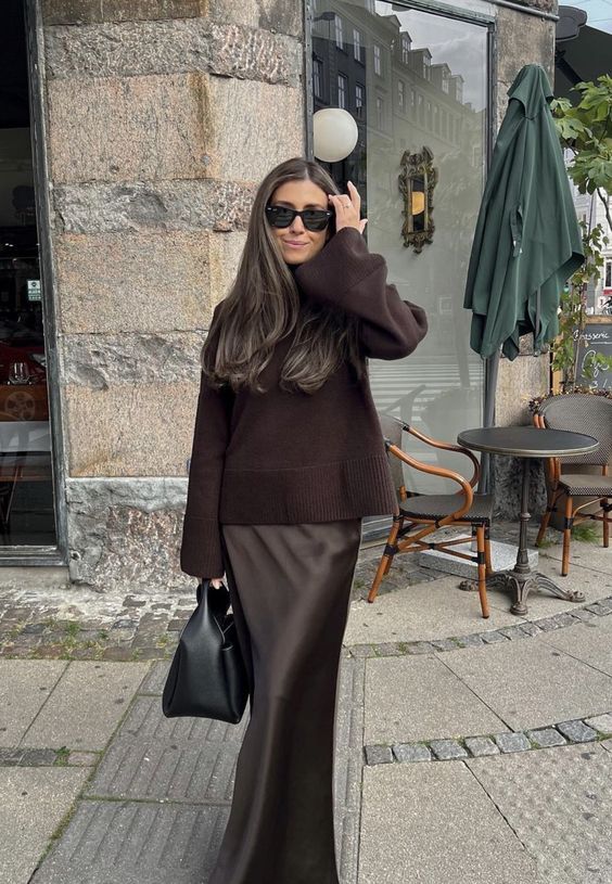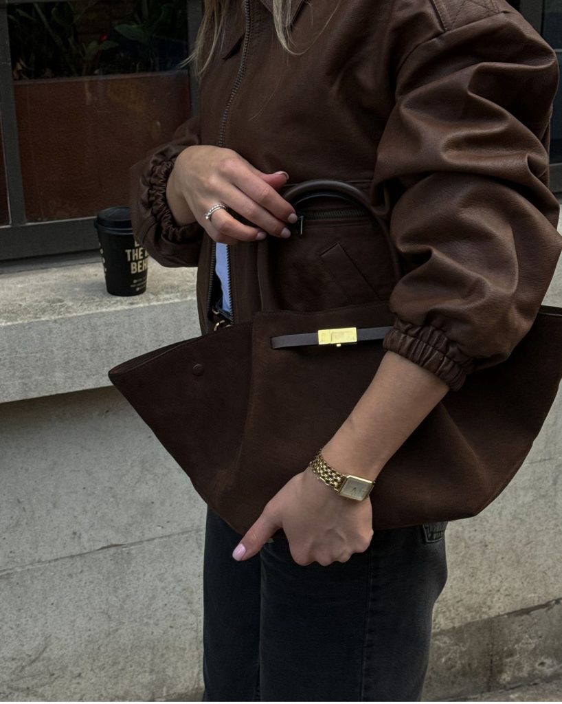 This chic monochrome moment features a fitted brown crop top paired with wide-leg trousers and an oversized brown leather jacket for a cozy, pulled-together feel. The suede bag, tortoiseshell glasses, and slicked-back bun add major old-money aesthetic vibes—ideal for a stylish coffee run or city errands.