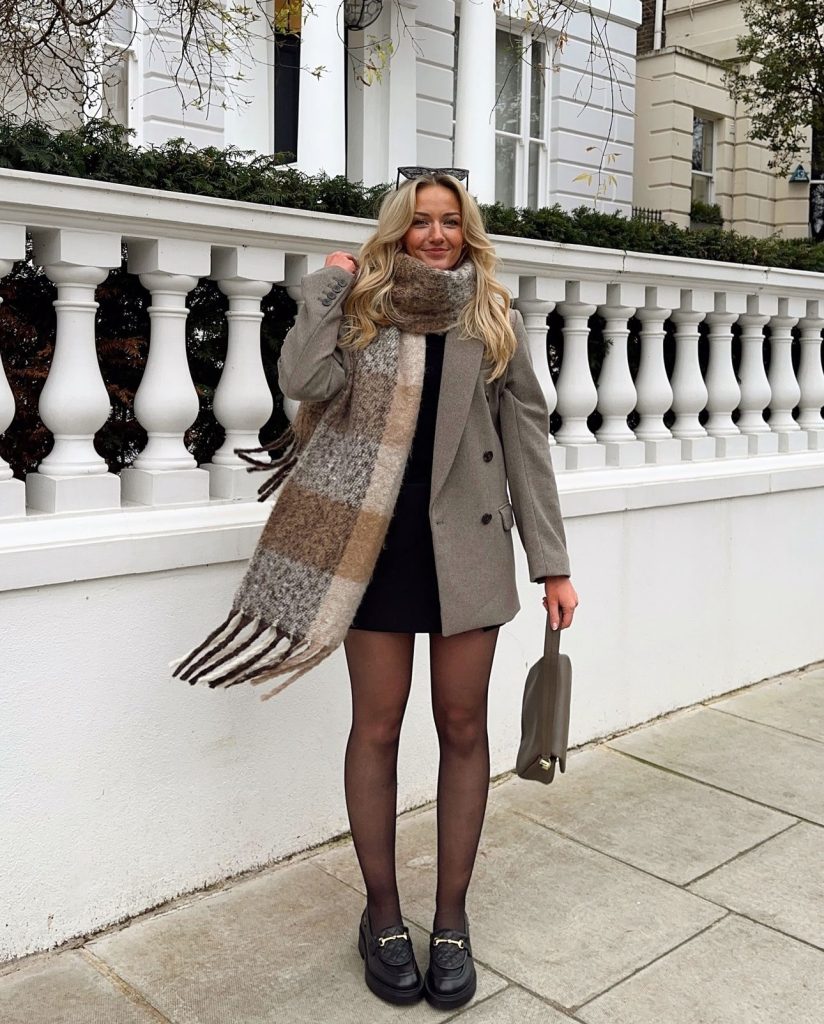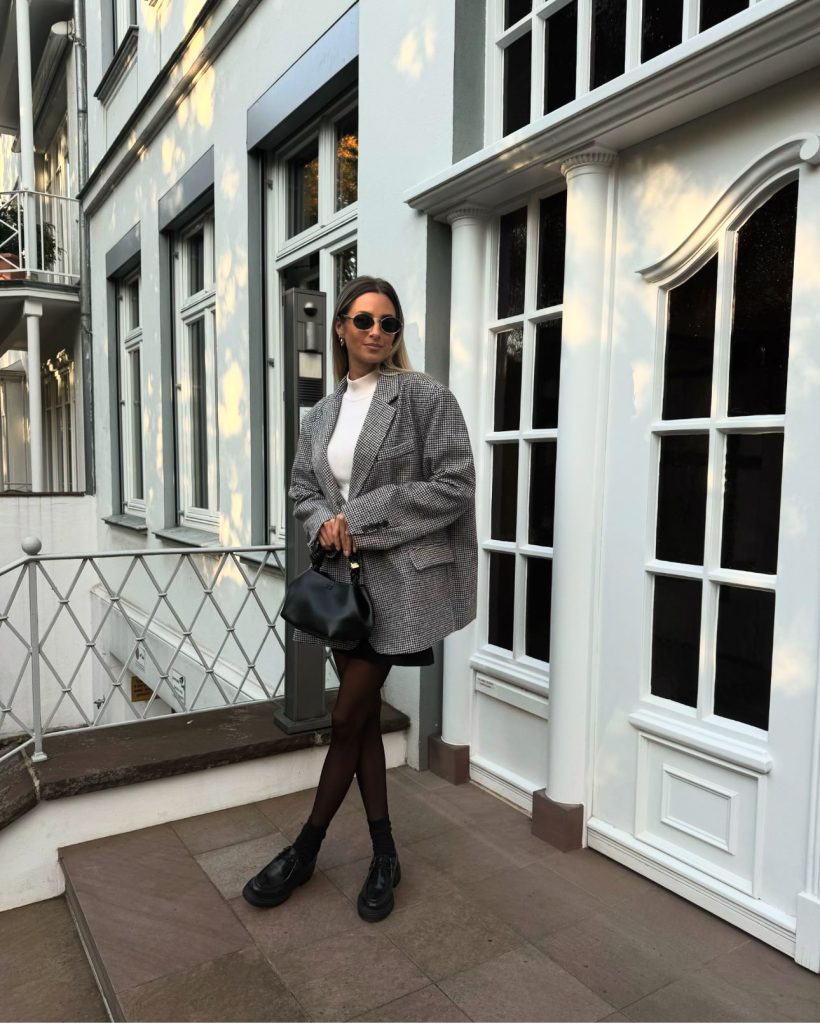 This Vogue-inspired look gives cool-girl Parisian energy with a striped top tucked into a black mini skirt, layered under an oversized black leather jacket. The sheer black tights, chunky loafers, and white socks add an extra preppy-meets-edgy aesthetic. Perfect for a bookstore run, an art gallery visit, or simply channeling that fashion week vibe.