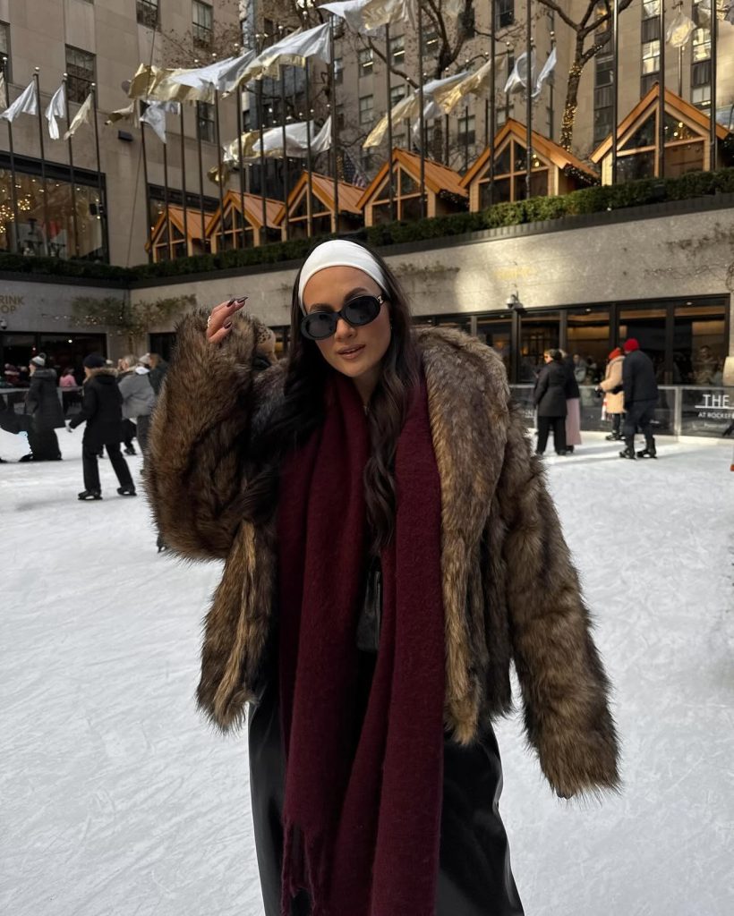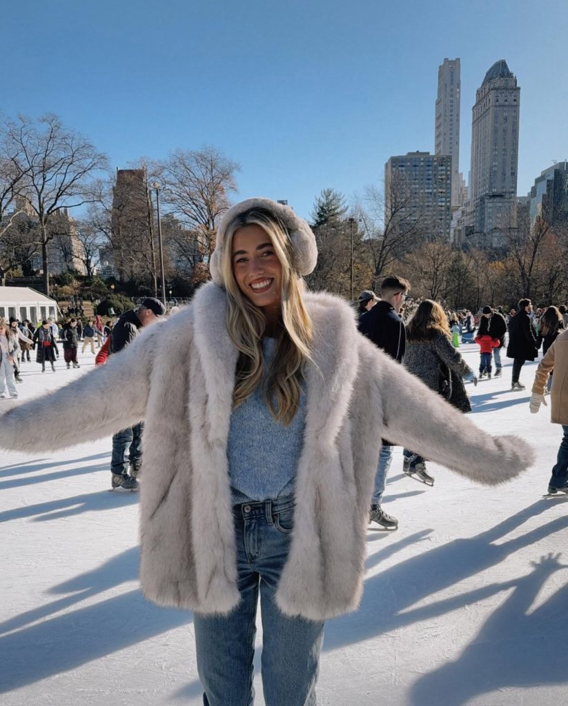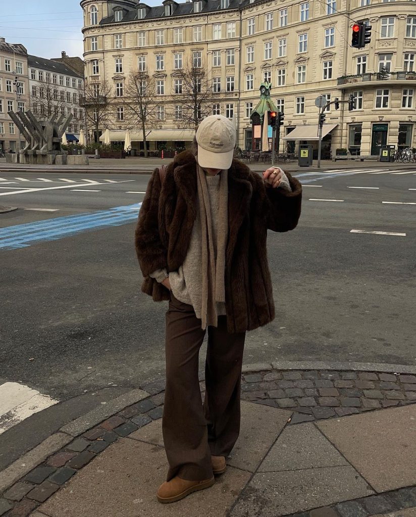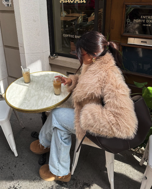 This faux fur coat paired with wide-leg jeans and classic UGG slippers is giving all the glam winter vibes! It’s the perfect cozy look for a stylish coffee date, keeping you warm while looking effortlessly chic.