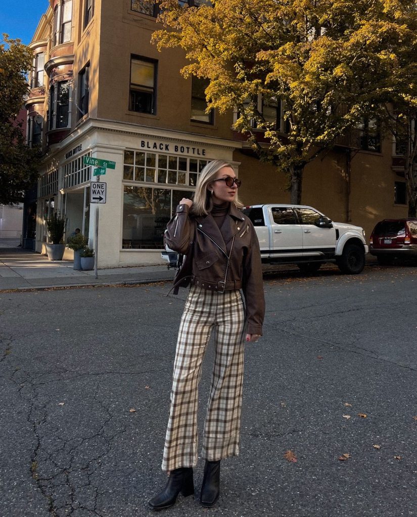 A sleek and edgy take on monochrome, this look pairs a cropped black leather jacket with high-waisted black wide-leg jeans. The contrast brown boots and mini structured bag give it that French girl meets city-edge appeal. Perfect for a night out or a day of shopping in Paris.