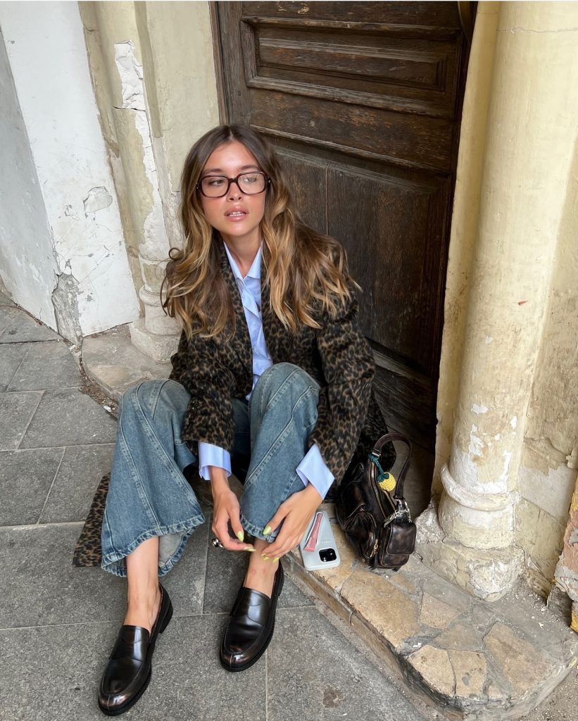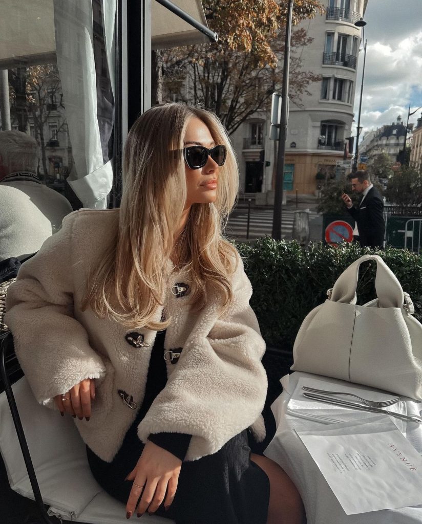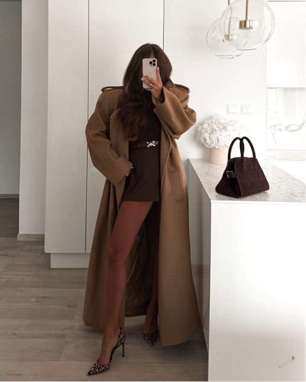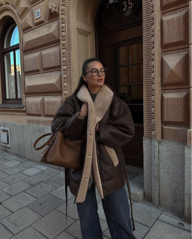 A cold-weather classic, this oversized shearling-lined leather jacket keeps things cozy while adding a fashion-forward edge. Paired with flared blue jeans, leather gloves, and sleek boots, this look is ideal for winter city walks or an après-ski moment in the mountains.