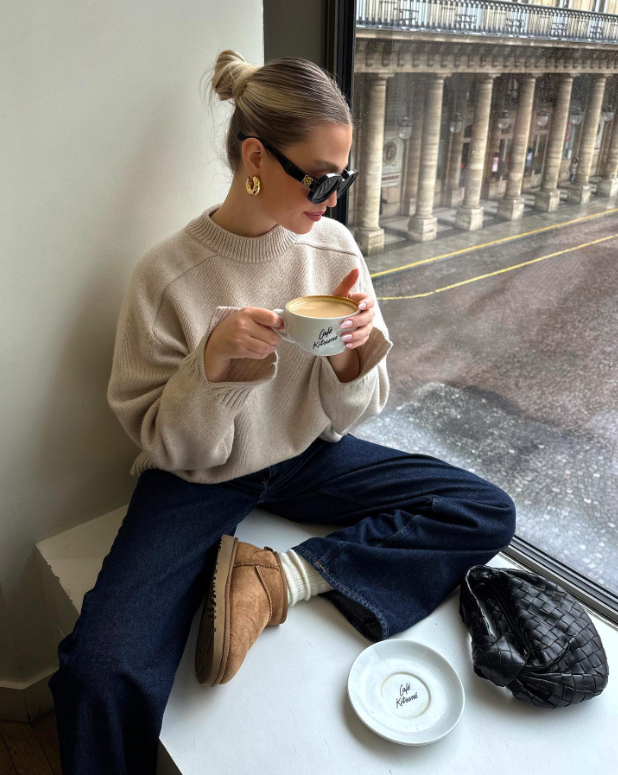 This cozy cream sweater paired with dark jeans and classic UGG slippers is perfect for a laid-back coffee date or a cozy morning at your favorite café. I love the simple elegance of this look, especially with those bold earrings and sleek sunglasses!