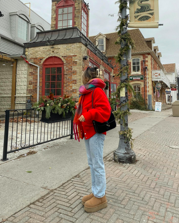 I adore the bold red coat paired with this multicolored scarf! The light jeans and tan UGG slippers make this outfit casual yet eye-catching. It’s perfect for a winter stroll in the city or holiday shopping.