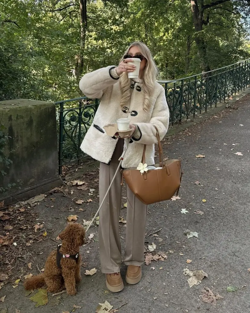 A fluffy duffle coat and taupe pants pair perfectly with classic UGG slippers for a cozy park stroll. This outfit exudes effortless fall fashion while staying comfortable and cute for an outdoor coffee run with your furry friend.